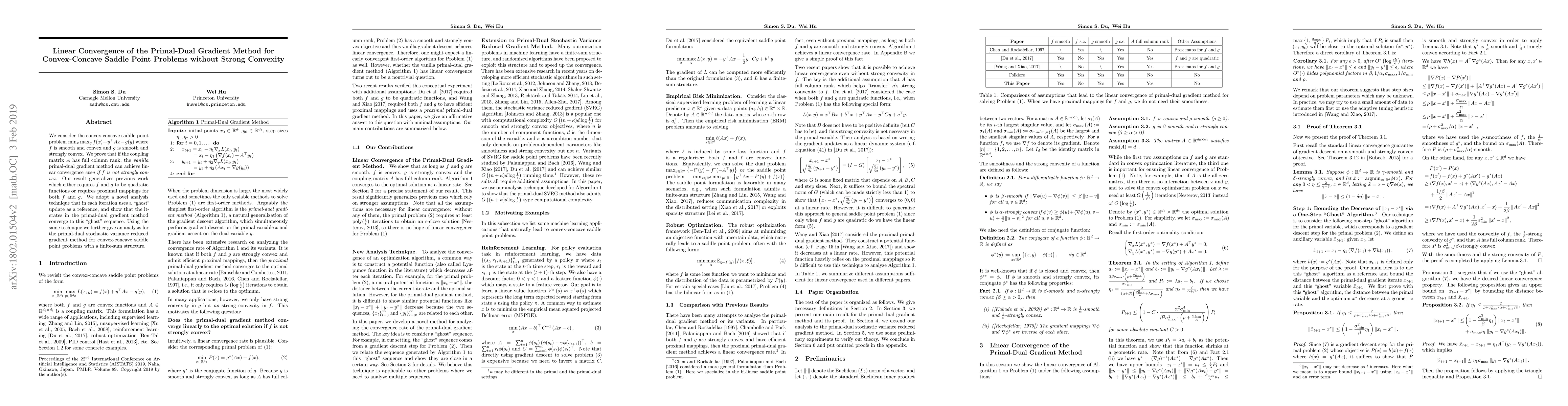 This paper proves linear convergence of the primal-dual gradient method for convex-concave saddle point problems without requiring strong convexity of $f$, provided $A$ is of full column rank. It generalizes prior work and introduces a novel analysis technique using a "ghost" update reference.