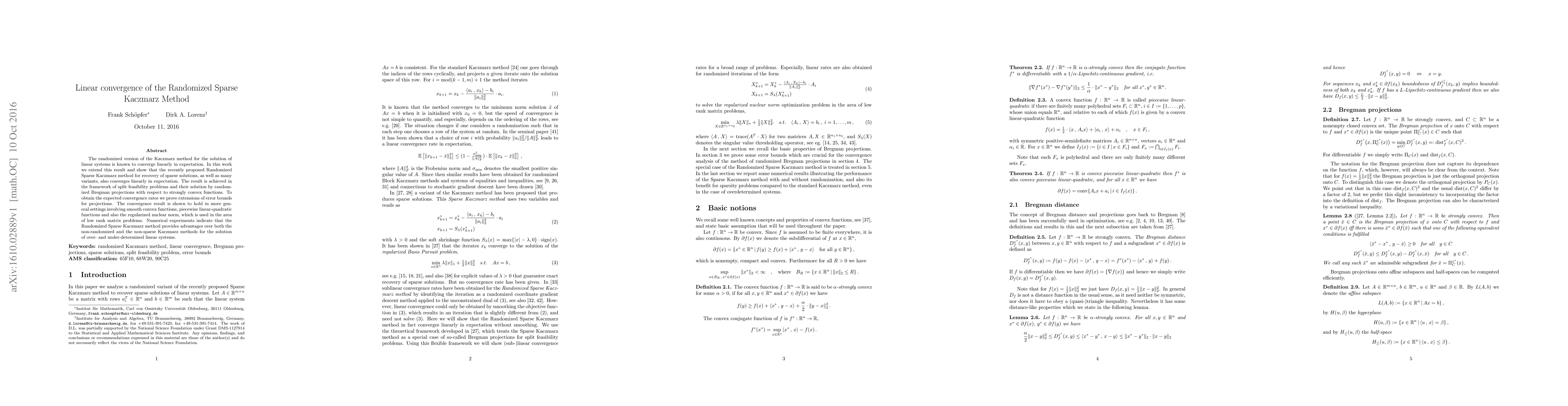 This paper demonstrates that the Randomized Sparse Kaczmarz method converges linearly in expectation for solving linear systems, extending the convergence properties of the traditional Kaczmarz method to sparse solutions. The results are shown within the context of split feasibility problems and apply to various convex functions, including regularized nuclear norms for low-rank matrix problems.