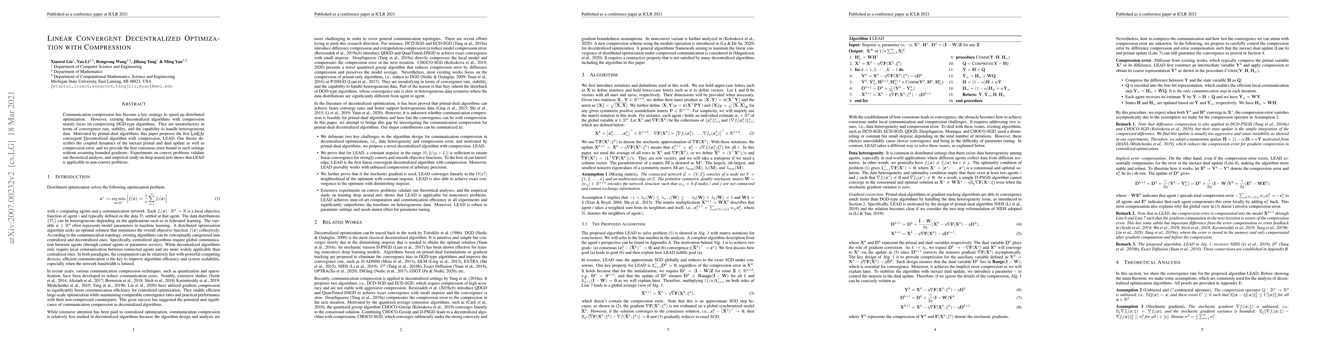 This paper introduces LEAD, the first linearly convergent decentralized optimization algorithm with compression, addressing limitations in convergence rate, stability, and handling of heterogeneous data. Theoretical analysis provides a consensus error bound without bounded gradient assumptions, validated by experiments on convex problems and empirical studies on deep neural networks.