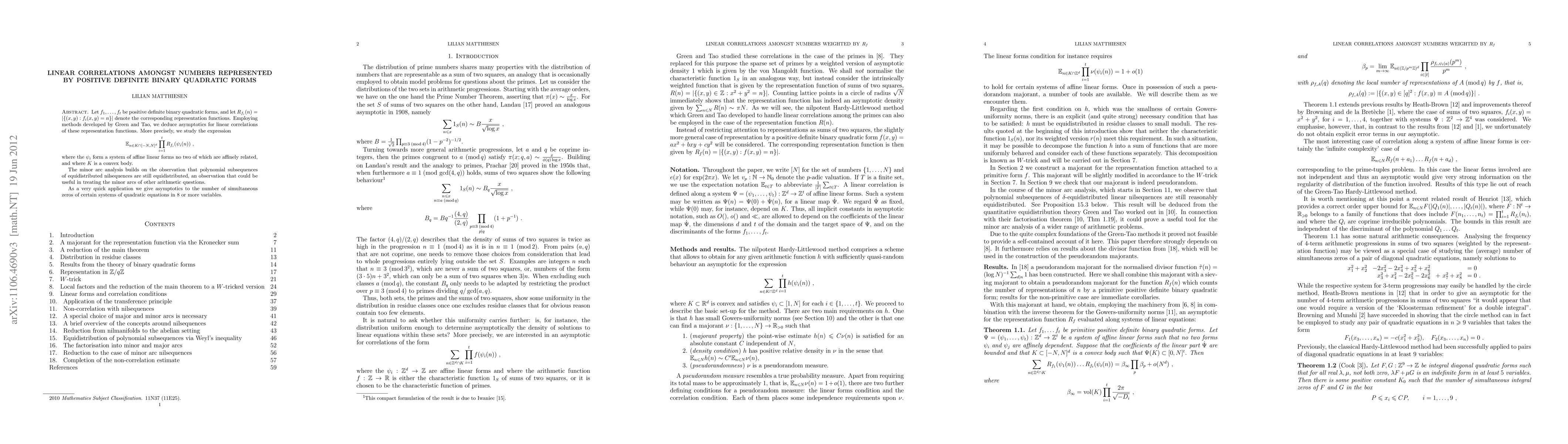 This paper investigates linear correlations among representation functions of positive definite binary quadratic forms, deriving an asymptotic formula for the sum of products of these functions shifted by integer multiples.