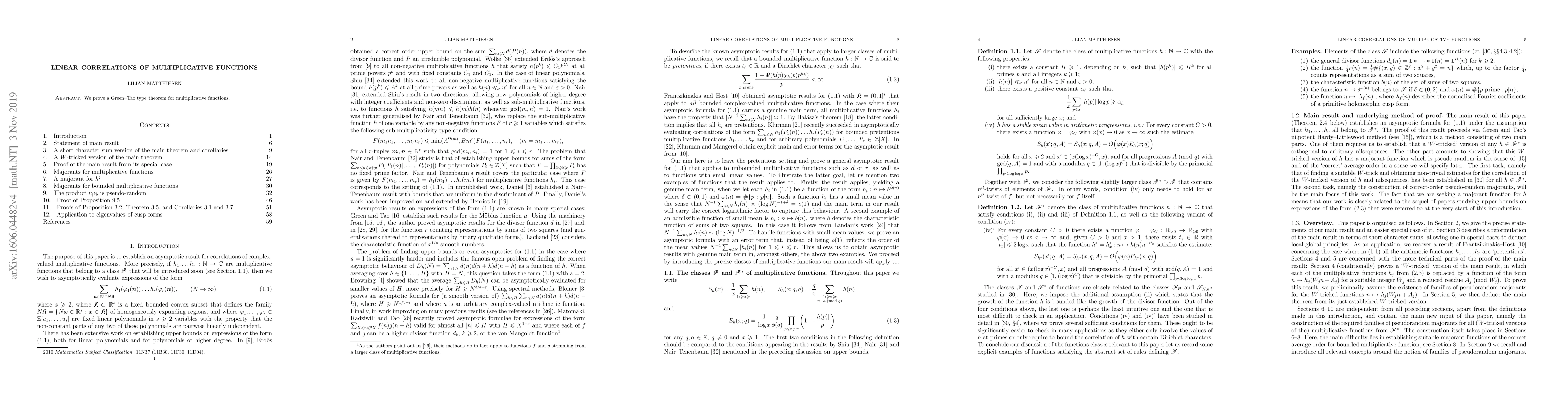 Summary: This paper establishes a Green--Tao theorem analogue for multiplicative functions, demonstrating linear correlations within these functions over arithmetic progressions. The result extends insights from classical number theory to function-based correlations.