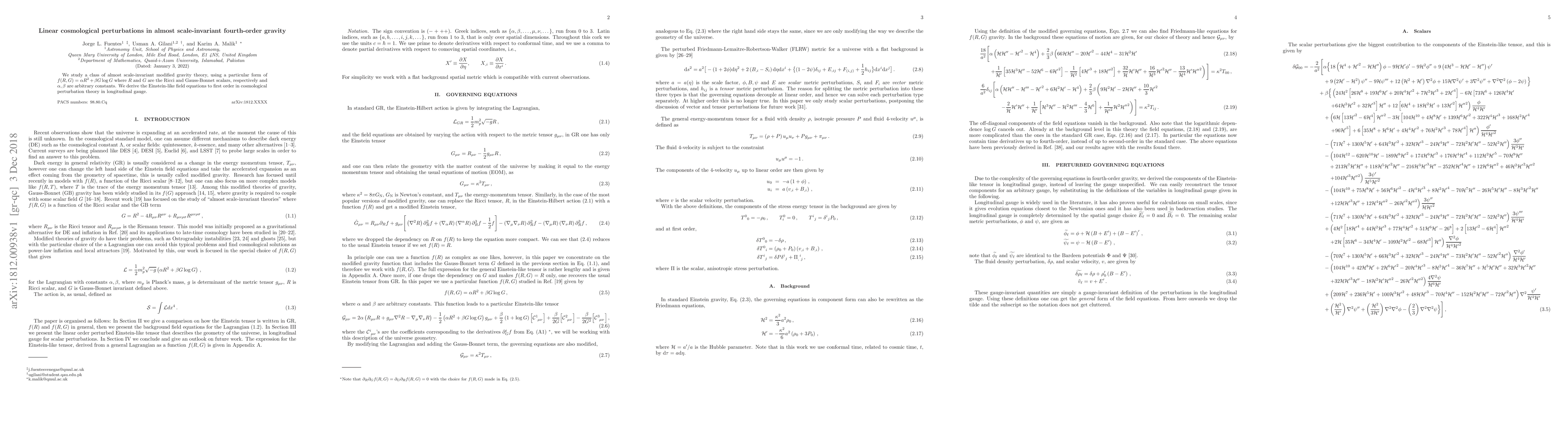 We study a class of almost scale-invariant modified gravity theories, using a particular form of $f(R, G) = \alpha R^2 + \beta G \log G$ where $R$ and $G$ are the Ricci and Gauss-Bonnet scalars, respectively and $\alpha$, $\beta$ are arbitrary constants. We derive the Einstein-like field equations to first order in cosmological perturbation theory in longitudinal gauge.