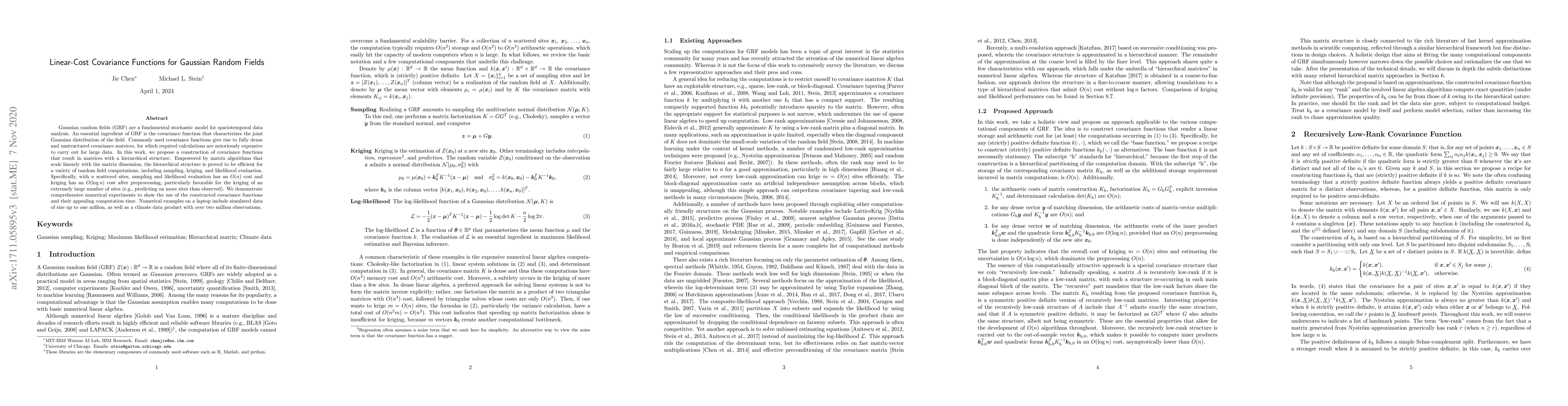 Gaussian random fields (GRF) are a fundamental stochastic model for spatiotemporal data analysis. An essential ingredient of GRF is the covariance function that characterizes the joint Gaussian distribution of the field. Commonly used covariance functions give rise to fully dense and unstructured covariance matrices, for which required calculations are notoriously expensive to carry out for large data. In this work, we propose a construction of covariance functions that result in matrices with a hierarchical structure. Empowered by matrix algorithms that scale linearly with the matrix dimension, the hierarchical structure is proved to be efficient for a variety of random field computations, including sampling, kriging, and likelihood evaluation. Specifically, with $n$ scattered sites, sampling and likelihood evaluation has an $O(n)$ cost and kriging has an $O(\log n)$ cost after preprocessing, particularly favorable for the kriging of an extremely large number of sites (e.g., predicting on more sites than observed). We demonstrate comprehensive numerical experiments to show the use of the constructed covariance functions and their appealing computation time. Numerical examples on a laptop include simulated data of size up to one million, as well as a climate data product with over two million observations.