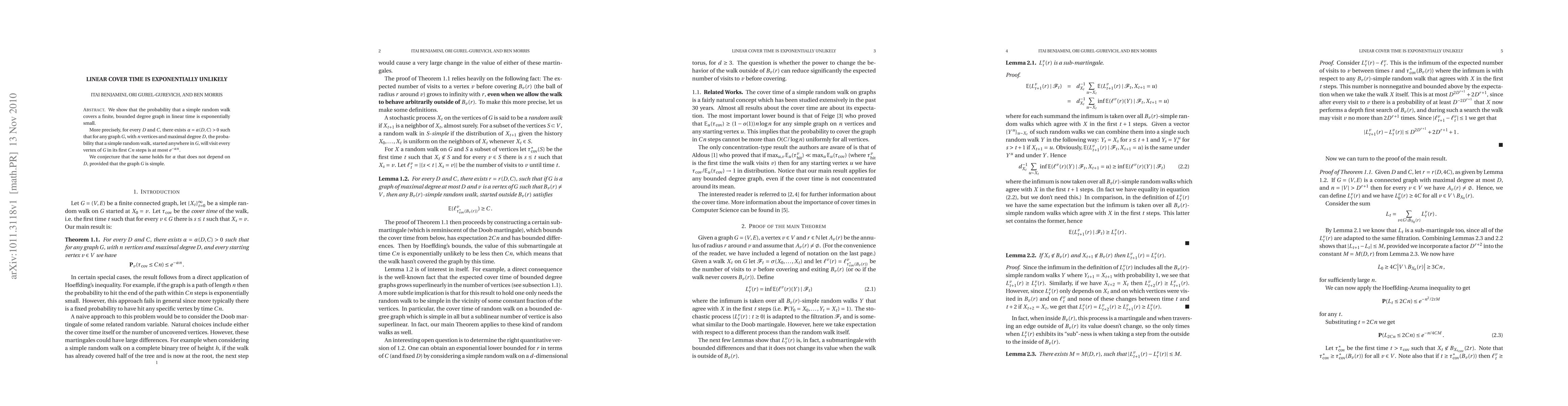 We show that the probability that a simple random walk covers a finite, bounded degree graph in linear time is exponentially small. More precisely, for every D and C, there exists a=a(D,C)>0 such that for any graph G, with n vertices and maximal degree D, the probability that a simple random walk, started anywhere in G, will visit every vertex of G in its first Cn steps is at most exp(-an). We conjecture that the same holds for a=a(C)>0 that does not depend on D, provided that the graph G is simple.