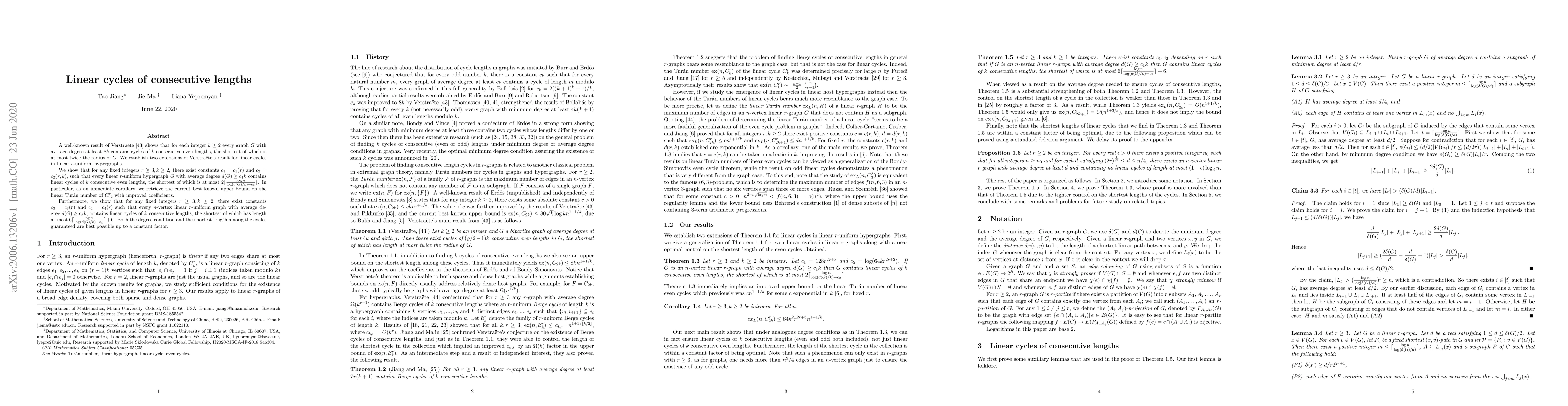 A well-known result of Verstra\"ete \cite{V00} shows that for each integer $k\geq 2$ every graph $G$ with average degree at least $8k$ contains cycles of $k$ consecutive even lengths, the shortest of which is at most twice the radius of $G$. We establish two extensions of Verstra\"ete's result for linear cycles in linear $r$-uniform hypergraphs. We show that for any fixed integers $r\geq 3,k\geq 2$, there exist constants $c_1=c_1(r)$ and $c_2=c_2(r,k)$, such that every linear $r$-uniform hypergraph $G$ with average degree $d(G)\geq c_1 k$ contains linear cycles of $k$ consecutive even lengths, the shortest of which is at most $2\lceil \frac{ \log n}{\log (d(G)/k)-c_2}\rceil$. In particular, as an immediate corollary, we retrieve the current best known upper bound on the linear Tur\'an number of $C^r_{2k}$ with improved coefficients. Furthermore, we show that for any fixed integers $r\geq 3,k\geq 2$, there exist constants $c_3=c_3(r)$ and $c_4=c_4(r)$ such that every $n$-vertex linear $r$-uniform graph with average degree $d(G)\geq c_3k$, contains linear cycles of $k$ consecutive lengths, the shortest of which has length at most $6\lceil \frac{\log n}{\log (d(G)/k)-c_4} \rceil +6$. Both the degree condition and the shortest length among the cycles guaranteed are best possible up to a constant factor.