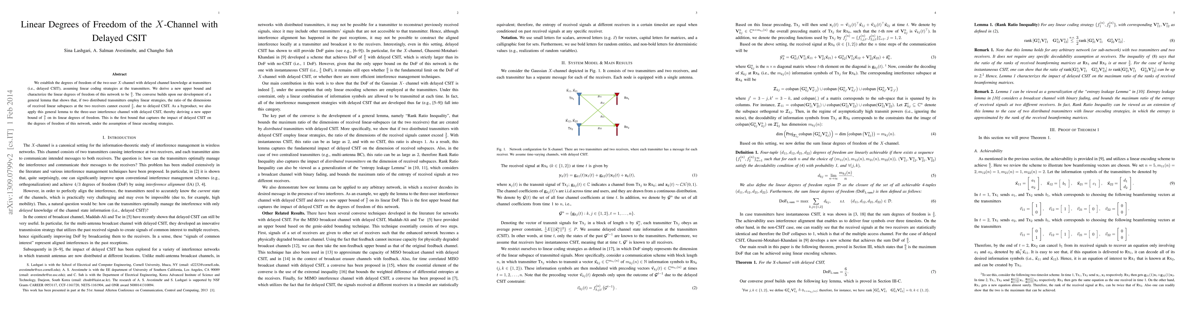 This paper establishes the linear degrees of freedom for the two-user X-channel with delayed transmitter channel state information (CSIT) as 6/5, deriving a new upper bound and applying a general lemma to also determine an upper bound of 9/7 for the three-user interference channel with delayed CSIT.