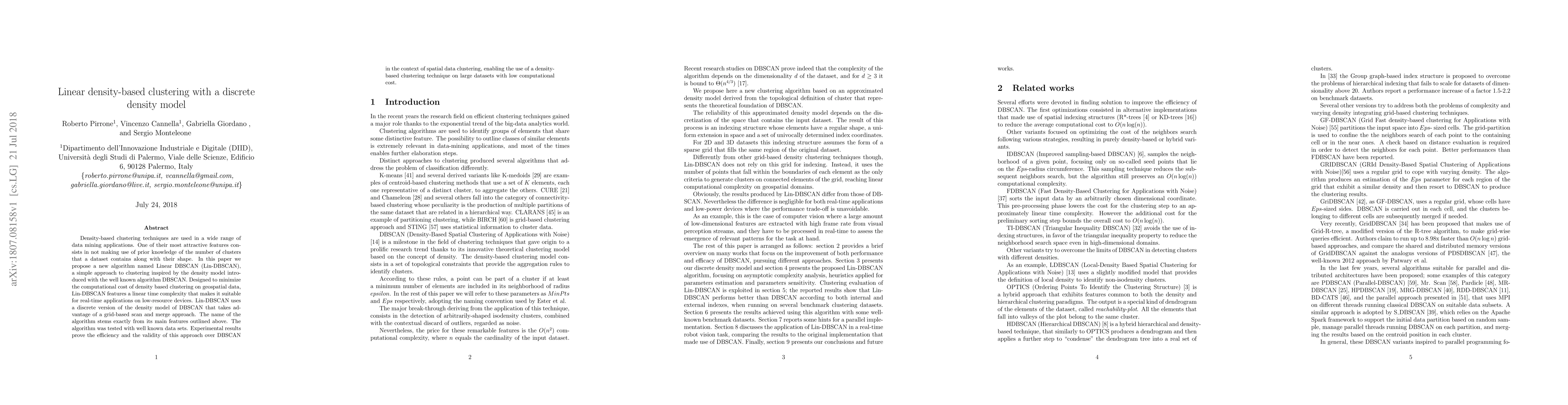 Density-based clustering techniques are used in a wide range of data mining applications. One of their most attractive features con- sists in not making use of prior knowledge of the number of clusters that a dataset contains along with their shape. In this paper we propose a new algorithm named Linear DBSCAN (Lin-DBSCAN), a simple approach to clustering inspired by the density model introduced with the well known algorithm DBSCAN. Designed to minimize the computational cost of density based clustering on geospatial data, Lin-DBSCAN features a linear time complexity that makes it suitable for real-time applications on low-resource devices. Lin-DBSCAN uses a discrete version of the density model of DBSCAN that takes ad- vantage of a grid-based scan and merge approach. The name of the algorithm stems exactly from its main features outlined above. The algorithm was tested with well known data sets. Experimental results prove the efficiency and the validity of this approach over DBSCAN in the context of spatial data clustering, enabling the use of a density-based clustering technique on large datasets with low computational cost.