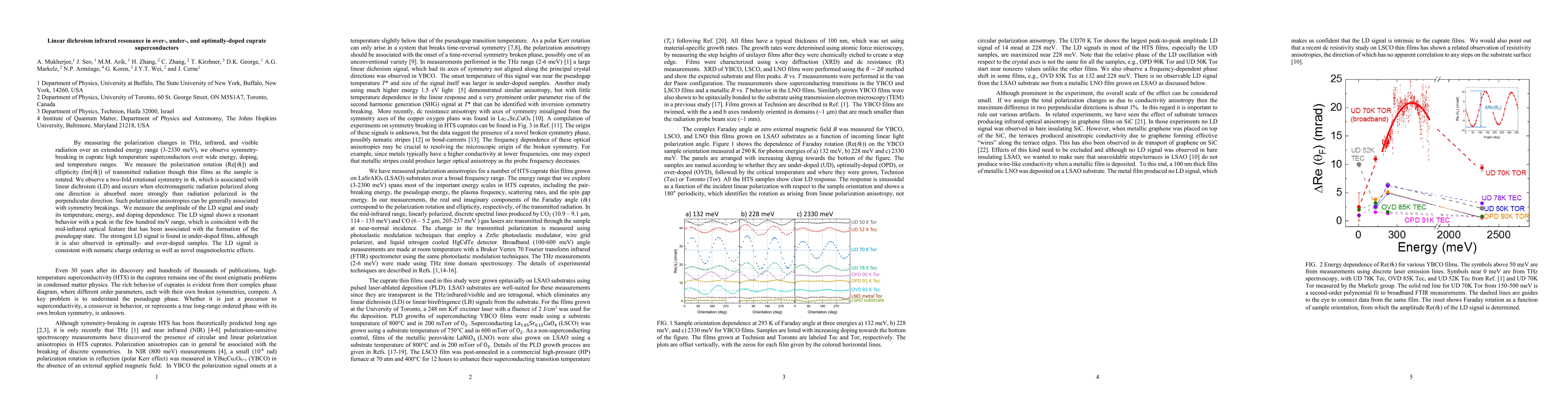 This study investigates symmetry-breaking phenomena in cuprate superconductors via linear dichroism infrared resonance, revealing a two-fold rotational symmetry in Faraday angle and a resonant LD signal peak associated with pseudogap state formation, with the strongest signal in under-doped samples.