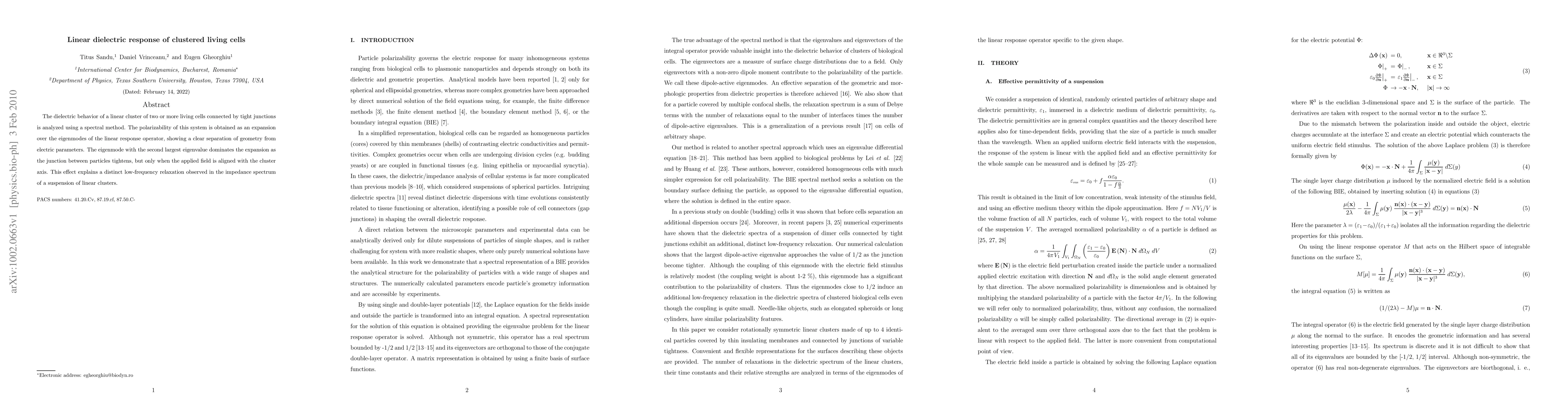 The dielectric behavior of a linear cluster of two or more living cells connected by tight junctions is analyzed using a spectral method. The polarizability of this system is obtained as an expansion over the eigenmodes of the linear response operator, showing a clear separation of geometry from electric parameters. The eigenmode with the second largest eigenvalue dominates the expansion as the junction between particles tightens, but only when the applied field is aligned with the cluster axis. This effect explains a distinct low-frequency relaxation observed in the impedance spectrum of a suspension of linear clusters.