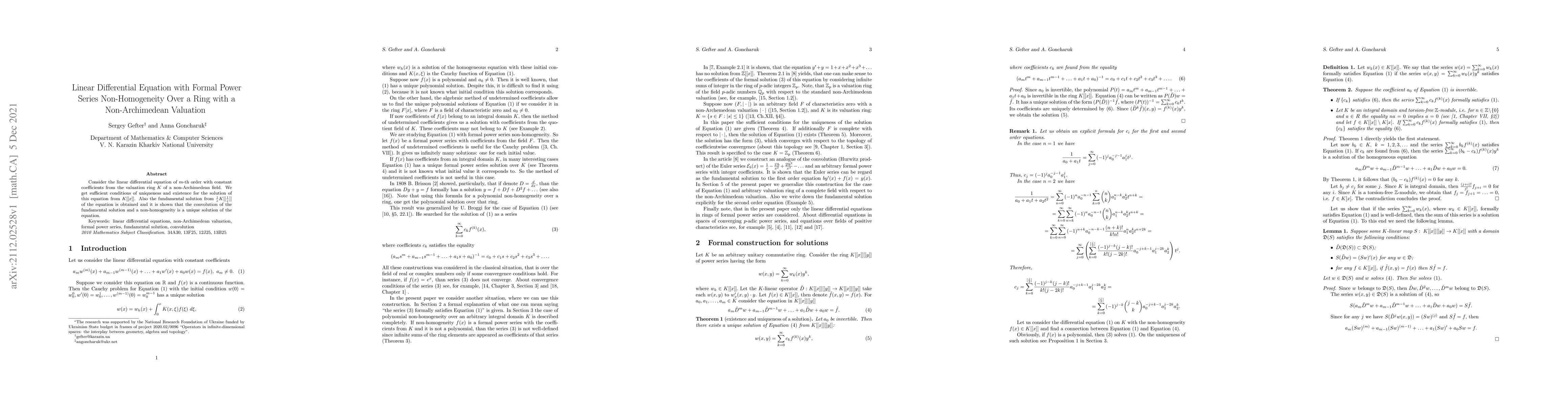 Consider the linear differential equation of $m$-th order with constant coefficients from the valuation ring $K$ of a non-Archimedean field. We get sufficient conditions of uniqueness and existence for the solution of this equation from $K[[x]]$. Also the fundamental solution from $\frac{1}{x}K[[\frac{1}{x}]]$ of the equation is obtained and it is shown that the convolution of the fundamental solution and a non-homogeneity is a unique solution of the equation.