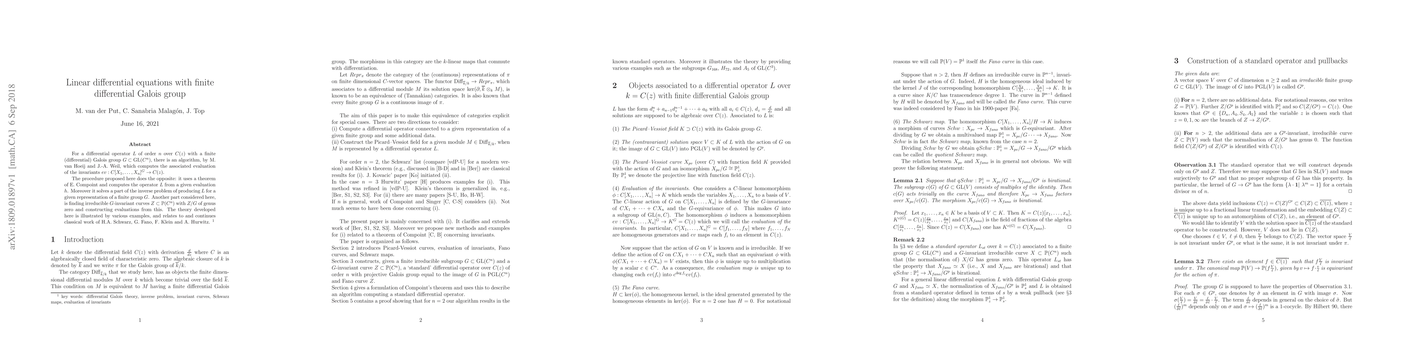 For a differential operator $L$ of order $n$ over $C(z)$ with a finite (differential) Galois group $G\subset {\rm GL}(C^n)$, there is an algorithm, by M. van Hoeij and J.-A.~Weil, which computes the associated evaluation of the invariants $ev:C[X_1,\dots ,X_n]^G\rightarrow C(z)$. The procedure proposed here does the opposite: it uses a theorem of E.~Compoint and computes the operator $L$ from a given evaluation $h$. Moreover it solves a part of the inverse problem of producing $L$ for a given representation of a finite group $G$. Another part considered here, is finding irreducible $G$-invariant curves $Z\subset \mathbb{P}(C^n)$ with $Z/G$ of genus zero and constructing evaluations from this. The theory developed here is illustrated by various examples, and relates to and continues classical work of H.A.~Schwarz, G.~Fano, F.~Klein and A.~Hurwitz.