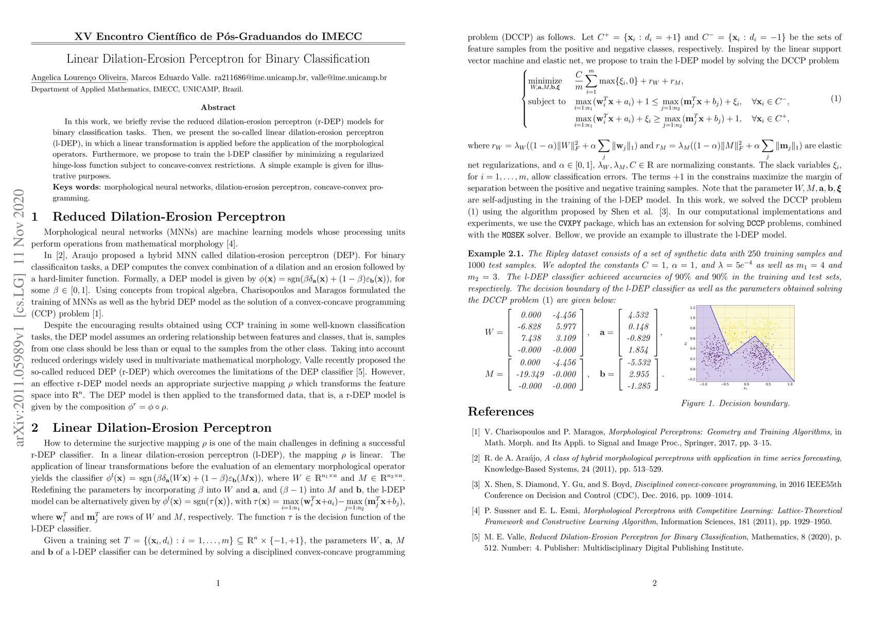 The introduction of the linear dilation-erosion perceptron (l-DEP) and its training via a regularized hinge-loss function subject to concave-convex restrictions.