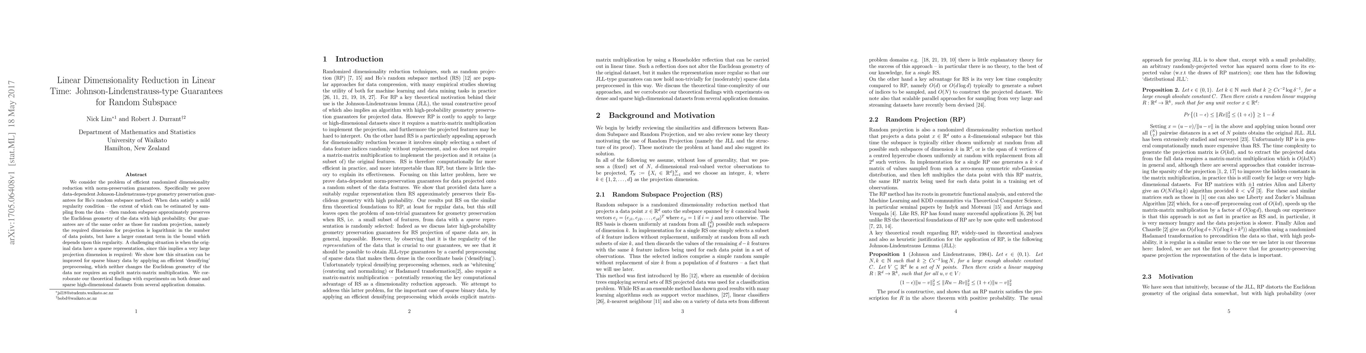 We consider the problem of efficient randomized dimensionality reduction with norm-preservation guarantees. Specifically we prove data-dependent Johnson-Lindenstrauss-type geometry preservation guarantees for Ho's random subspace method: When data satisfy a mild regularity condition -- the extent of which can be estimated by sampling from the data -- then random subspace approximately preserves the Euclidean geometry of the data with high probability. Our guarantees are of the same order as those for random projection, namely the required dimension for projection is logarithmic in the number of data points, but have a larger constant term in the bound which depends upon this regularity. A challenging situation is when the original data have a sparse representation, since this implies a very large projection dimension is required: We show how this situation can be improved for sparse binary data by applying an efficient `densifying' preprocessing, which neither changes the Euclidean geometry of the data nor requires an explicit matrix-matrix multiplication. We corroborate our theoretical findings with experiments on both dense and sparse high-dimensional datasets from several application domains.