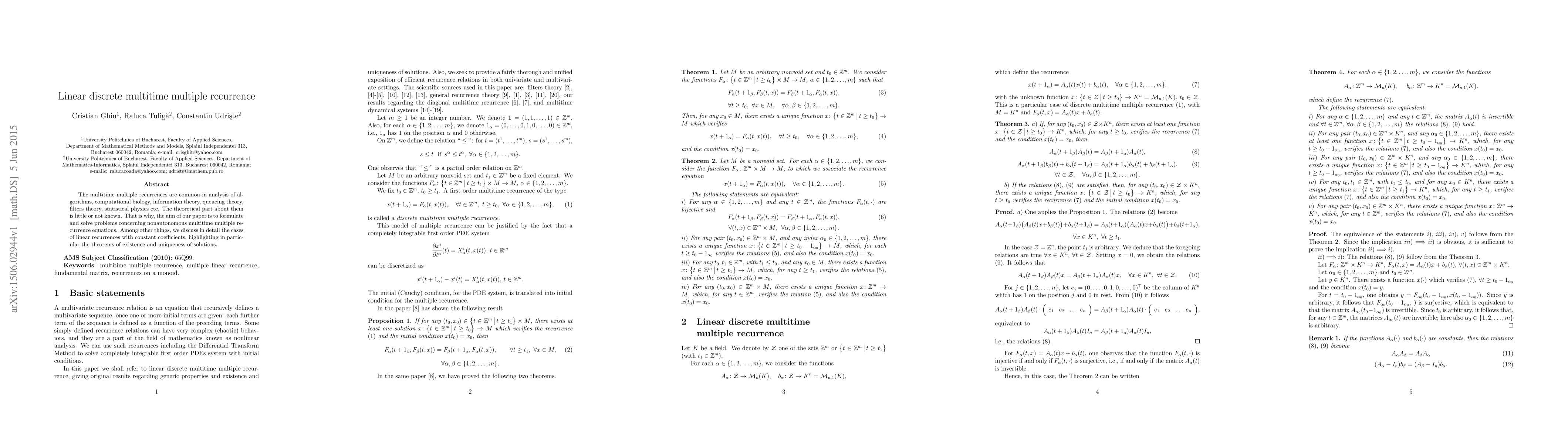 This paper investigates nonautonomous multitime multiple recurrence equations, focusing on linear discrete recurrences with constant coefficients. It formulates and proves theorems regarding the existence and uniqueness of solutions to these equations.