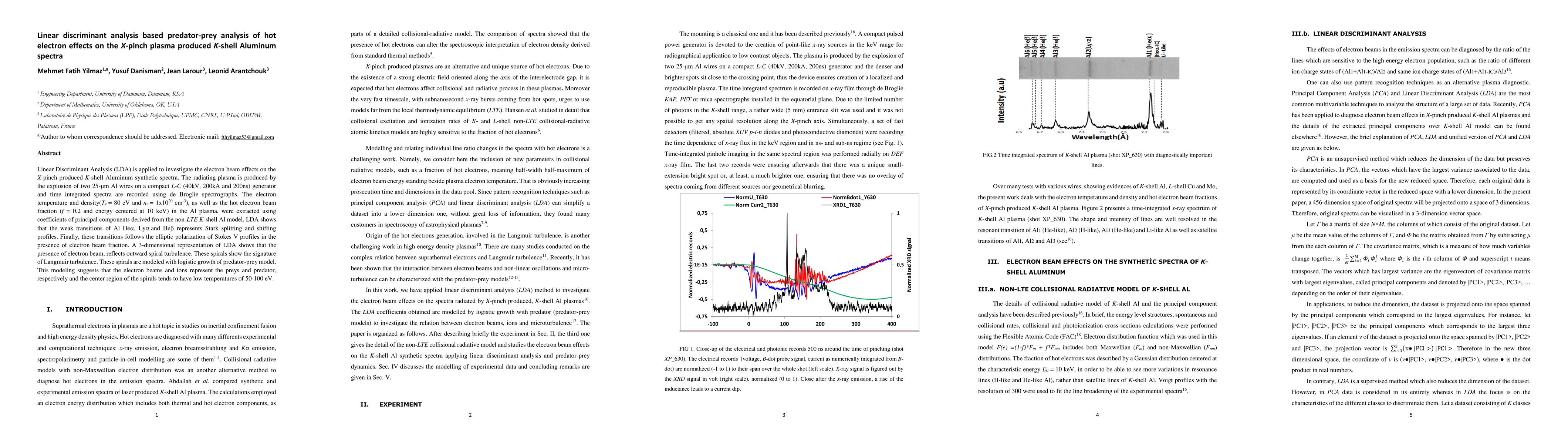 Researchers used Linear Discriminant Analysis to study the effects of electron beams on X-pinch plasma produced K-shell Aluminum spectra, finding that weak transitions indicate Stark splitting and shifting profiles with outward spiral turbulence modeled using a predator-prey logistic growth model.