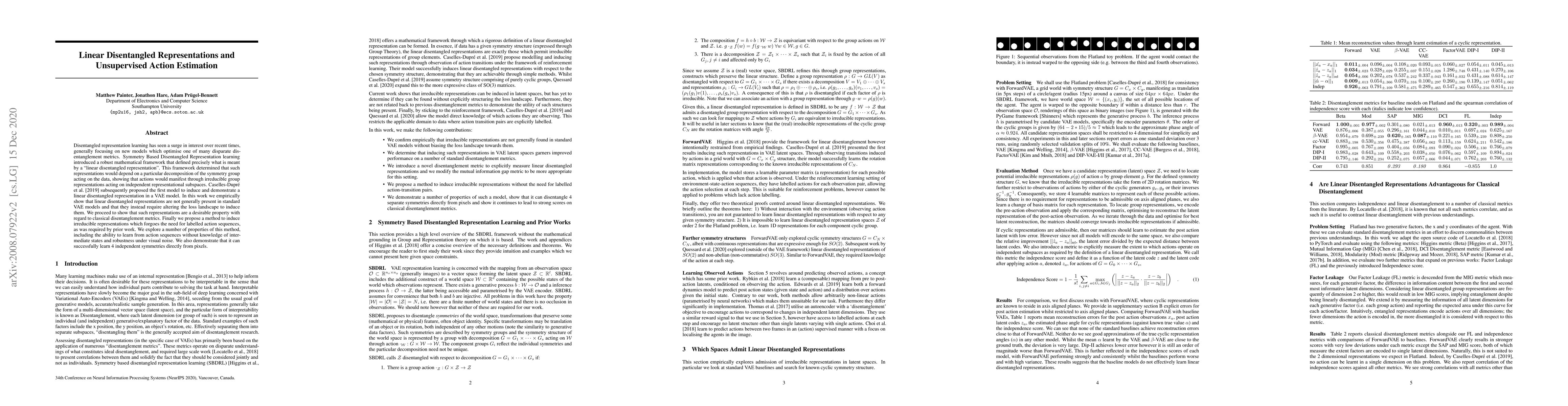 This paper investigates the induction of linear disentangled representations in Variational Autoencoders (VAEs) and proposes a method to achieve this without requiring labelled action sequences. It demonstrates that standard VAE models do not naturally produce such representations and that altering the loss landscape is necessary. The proposed method learns irreducible representations, showcasing robustness and the ability to estimate actions directly from pixels without intermediate state knowledge.
