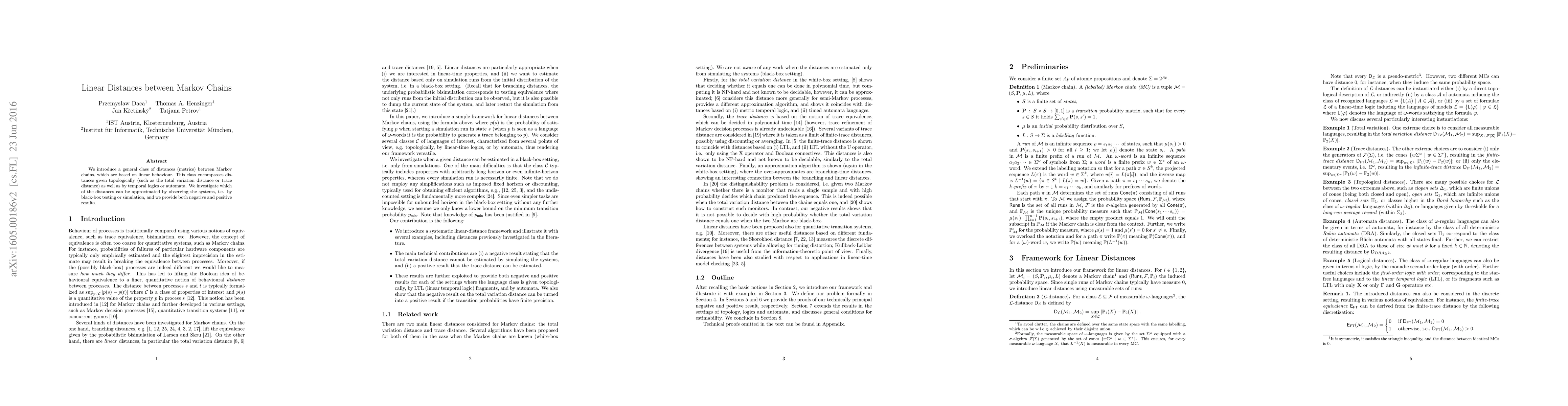 This paper introduces a new class of linear metrics for measuring distances between Markov chains, encompassing both topological and temporal logic-based distances. It explores the feasibility of approximating these distances through system observation and simulation, presenting both positive and negative results on this approximation capability.