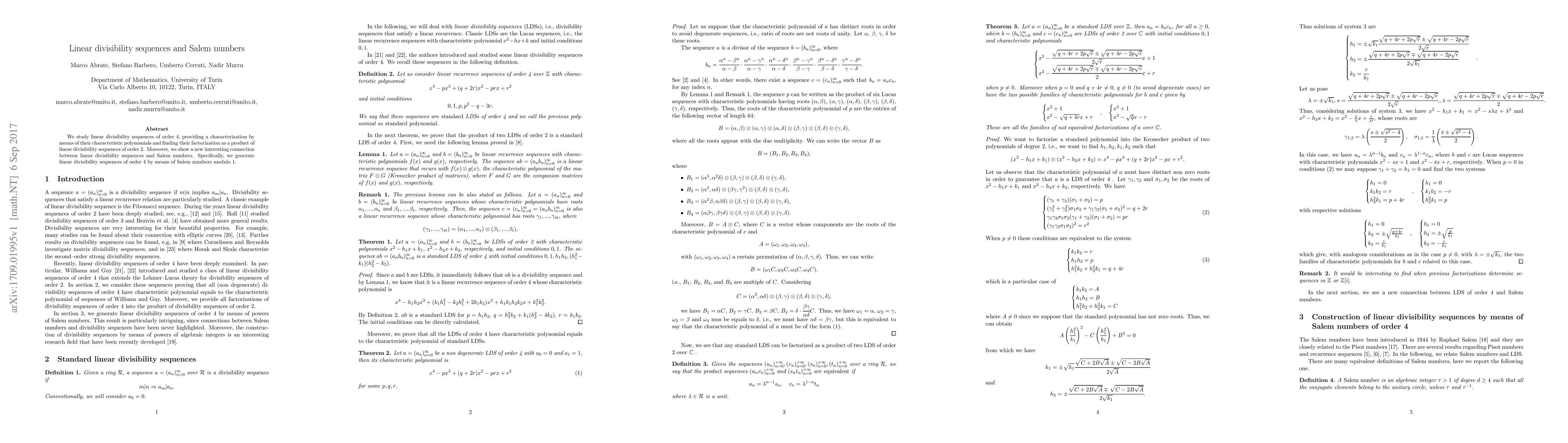 This paper characterizes linear divisibility sequences of order 4 through their characteristic polynomials and factors them into sequences of order 2. It also uncovers a novel link between these sequences and Salem numbers, demonstrating that sequences of order 4 can be generated using Salem numbers modulo 1.