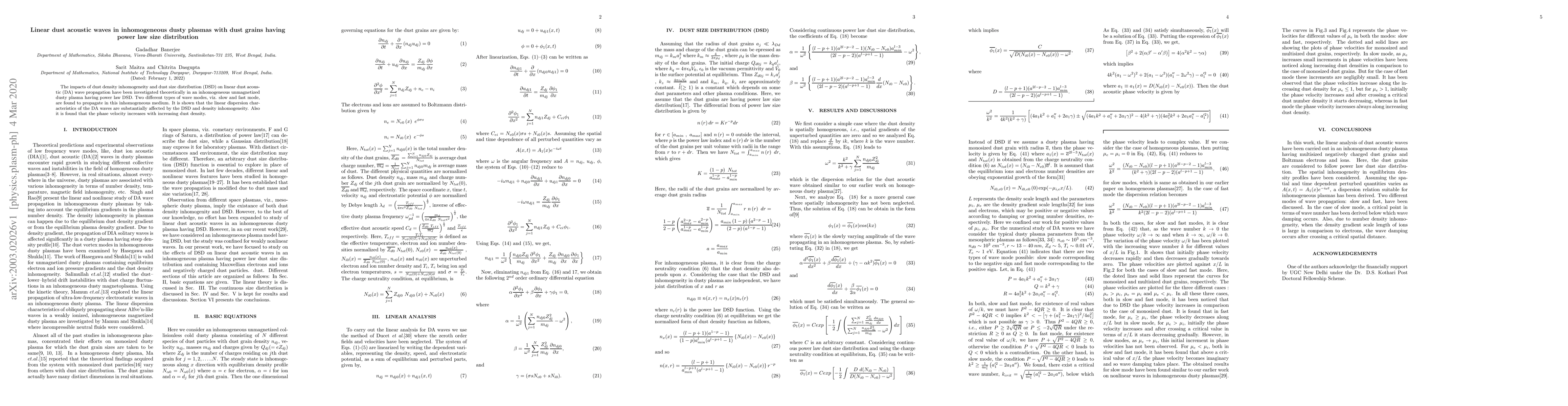 Summary: This study investigates the effects of dust density inhomogeneity and power law dust size distribution on linear dust acoustic wave propagation in unmagnetized dusty plasmas. It reveals two wave modes and shows that dispersion characteristics and phase velocity are significantly influenced by the dust size distribution and density variations.