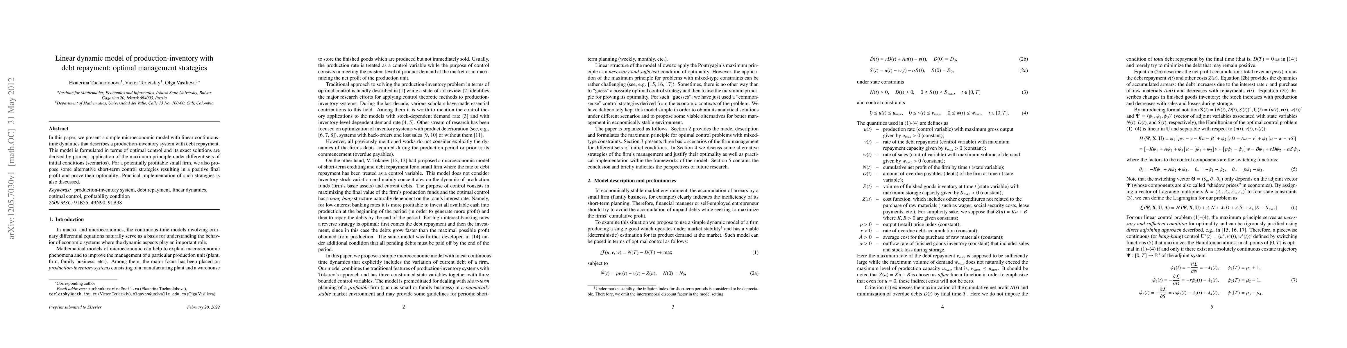 This paper develops a linear dynamic model for a production-inventory system with debt repayment, deriving optimal control strategies using the maximum principle. It proposes alternative short-term management strategies for small firms, proving their optimality and discussing practical implementation.