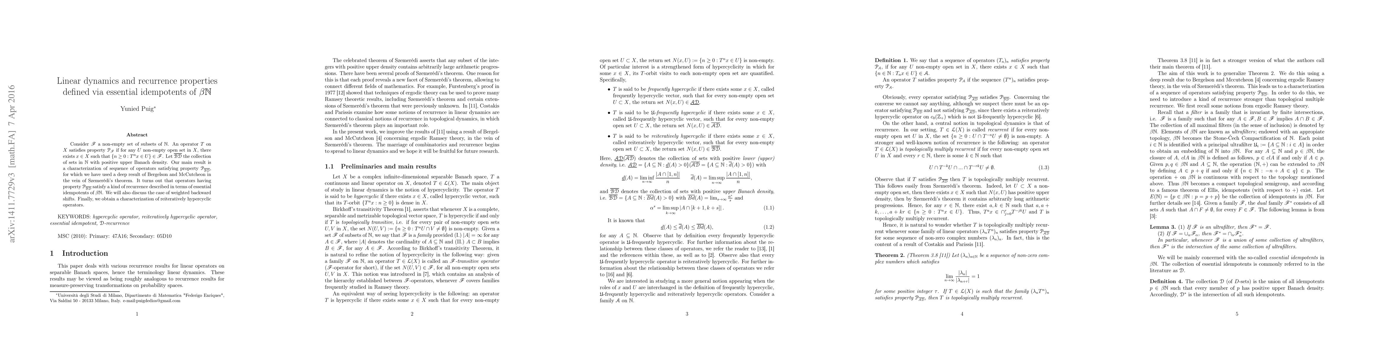 Researchers characterize operators that satisfy a property related to recurrence and hypercyclicity in terms of essential idempotents of the Stone-Česław compactification of the natural numbers.