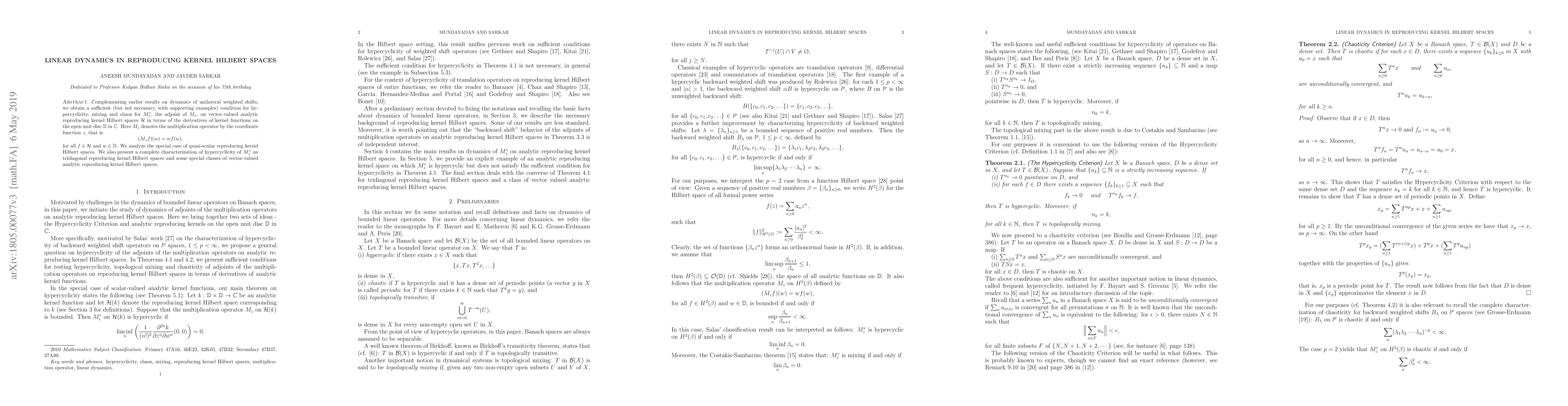 Complementing earlier results on dynamics of unilateral weighted shifts, we obtain a sufficient (but not necessary, with supporting examples) condition for hypercyclicity, mixing and chaos for $M_z^*$, the adjoint of $M_z$, on vector-valued analytic reproducing kernel Hilbert spaces $\mathcal{H}$ in terms of the derivatives of kernel functions on the open unit disc $\mathbb{D}$ in $\mathbb{C}$. Here $M_z$ denotes the multiplication operator by the coordinate function $z$, that is \[ (M_z f) (w) = w f(w), \] for all $f \in \mathcal{H}$ and $w \in \mathbb{D}$. We analyze the special case of quasi-scalar reproducing kernel Hilbert spaces. We also present a complete characterization of hypercyclicity of $M_z^*$ on tridiagonal reproducing kernel Hilbert spaces and some special classes of vector-valued analytic reproducing kernel Hilbert spaces.