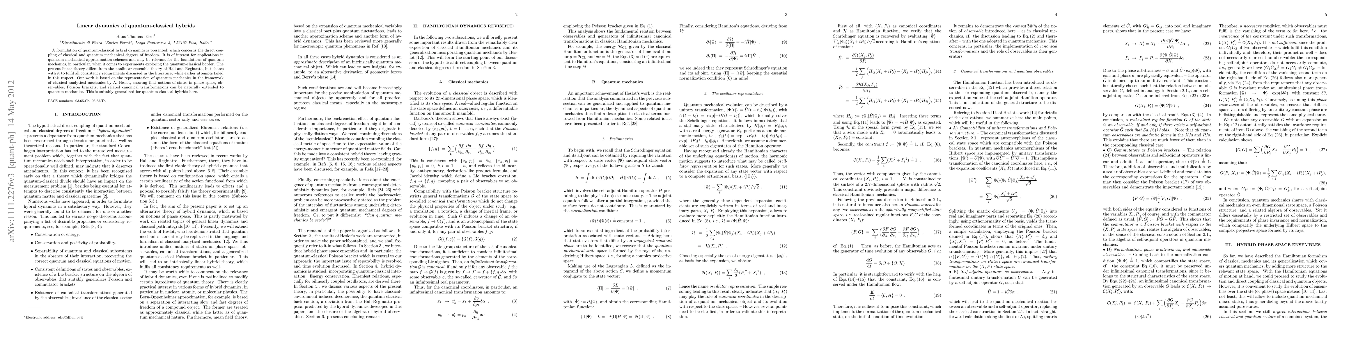 A formulation of quantum-classical hybrid dynamics is presented, which concerns the direct coupling of classical and quantum mechanical degrees of freedom. It is of interest for applications in quantum mechanical approximation schemes and may be relevant for the foundations of quantum mechanics, in particular, when it comes to experiments exploring the quantum-classical border. The present linear theory differs from the nonlinear ensemble theory of Hall and Reginatto, but shares with it to fullfill all consistency requirements discussed in the literature, while earlier attempts failed in this respect. Our work is based on the representation of quantum mechanics in the framework of classical analytical mechanics by A. Heslot, showing that notions of states in phase space, observables, Poisson brackets, and related canonical transformations can be naturally extended to quantum mechanics. This is suitably generalized for quantum-classical hybrids here.