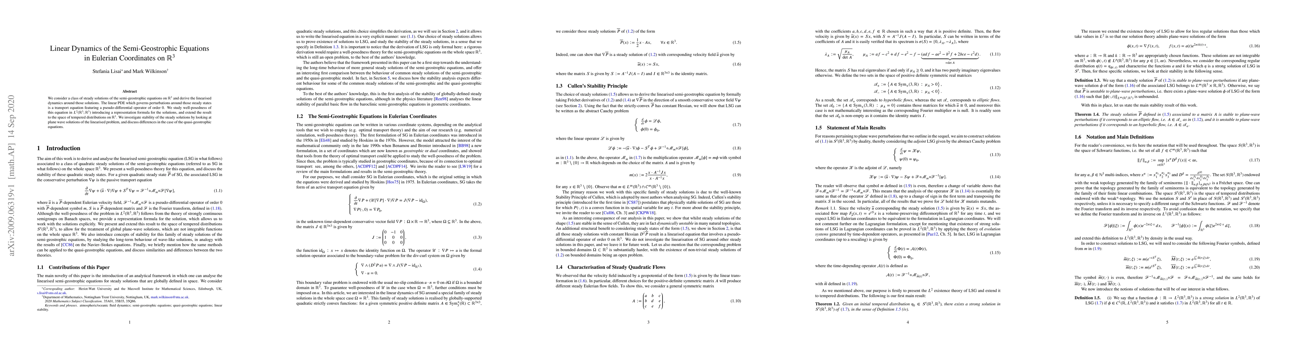 We consider a class of steady solutions of the semi-geostrophic equations on $\mathbb{R}^3$ and derive the linearised dynamics around those solutions. The linear PDE which governs perturbations around those steady states is a transport equation featuring a pseudo-differential operator of order 0. We study well-posedness of this equation in $L^2(\mathbb{R}^3;\mathbb{R}^3)$ introducing a representation formula for the solutions, and extend the result to the space of tempered distributions on $\mathbb{R}^{3}$. We investigate stability of the steady solutions by looking at plane wave solutions of the linearised problem, and discuss differences in the case of the quasi-geostrophic equations.