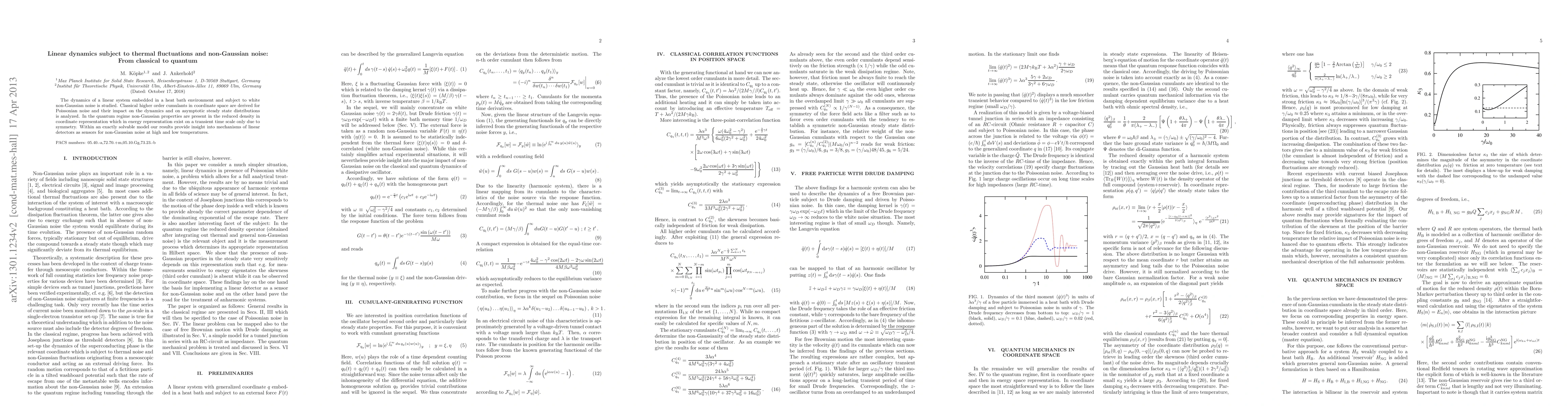 The dynamics of a linear system embedded in a heat bath environment and subject to non- Gaussian noise is studied. Higher order cumulants in coordinate space are derived and their impact on the dynamics and on asymptotic steady state distributions is analyzed. In the quantum regime non-Gaussian properties are present in the reduced density in coordinate representation which in energy representation exist on a transient time scale only due to symmetry. Within an exactly solvable model our results provide insight into mechanisms of linear detectors as sensors for non- Gaussian noise at high and low temperatures.