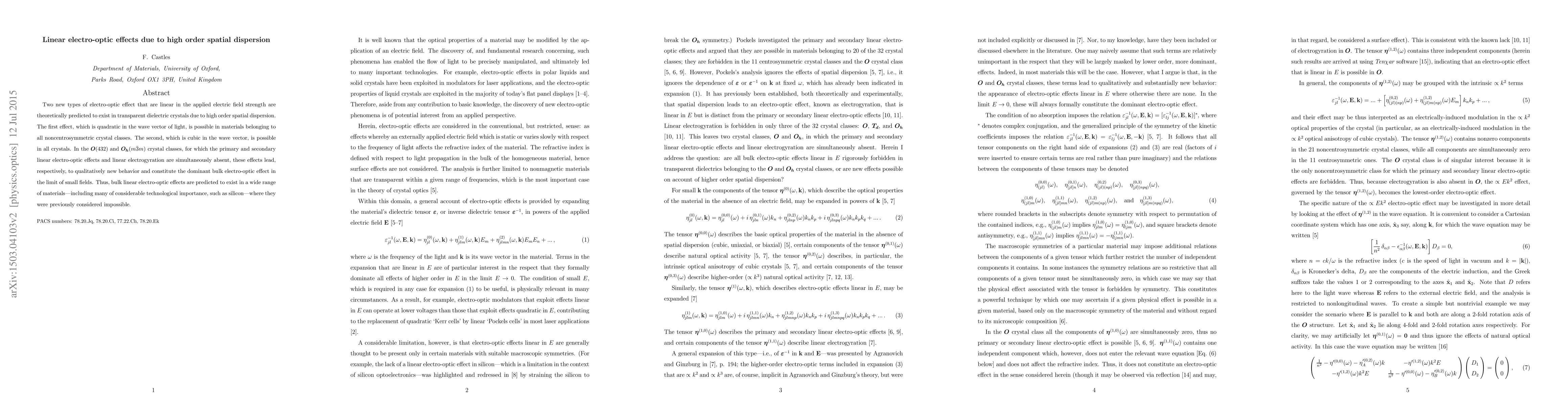 The paper predicts the existence of two new linear electro-optic effects in transparent dielectric crystals due to high order spatial dispersion. These effects, one quadratic and one cubic in the wave vector, occur in all noncentrosymmetric and all crystal classes, respectively, expanding the range of materials where bulk linear electro-optic effects are possible, including technologically significant materials like silicon.