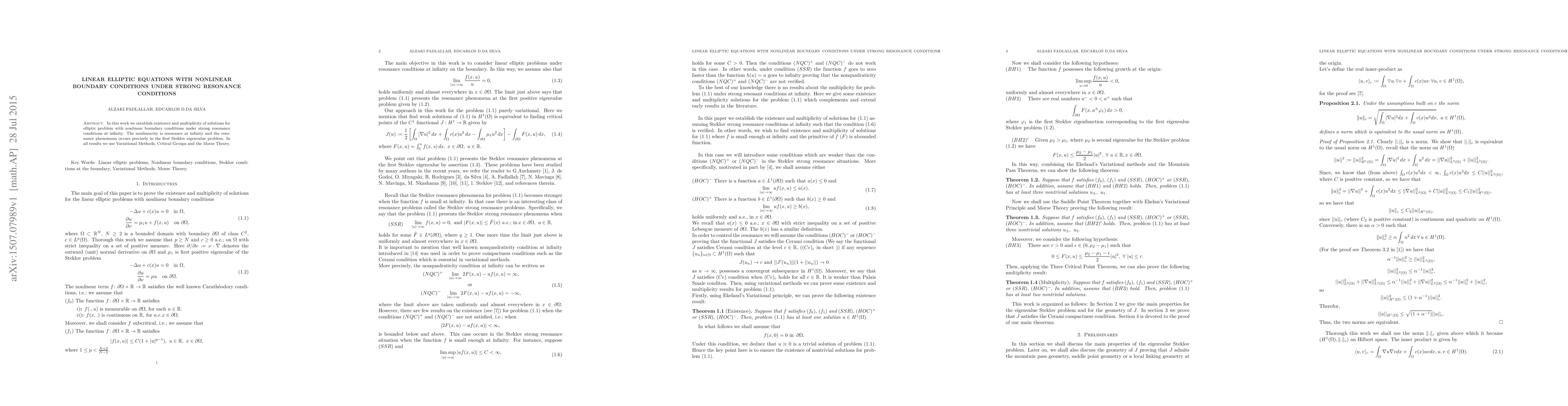 This paper establishes the existence and multiplicity of solutions for linear elliptic equations with nonlinear boundary conditions under strong resonance conditions, focusing on resonance phenomena in the first Steklov eigenvalue problem, utilizing Variational Methods, Critical Groups, and Morse Theory.