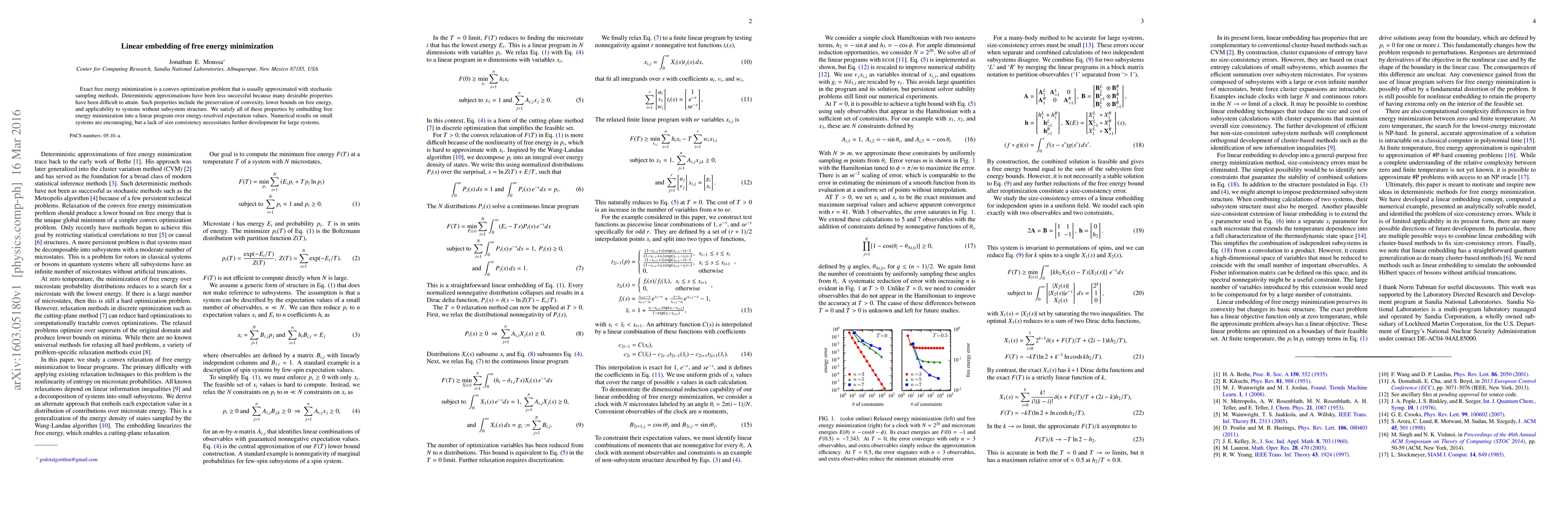 This paper presents a novel linear embedding method for exact free energy minimization, achieving convexity, lower bounds, and applicability without subsystem structure. Initial numerical results are promising but require further development for scalability to larger systems.