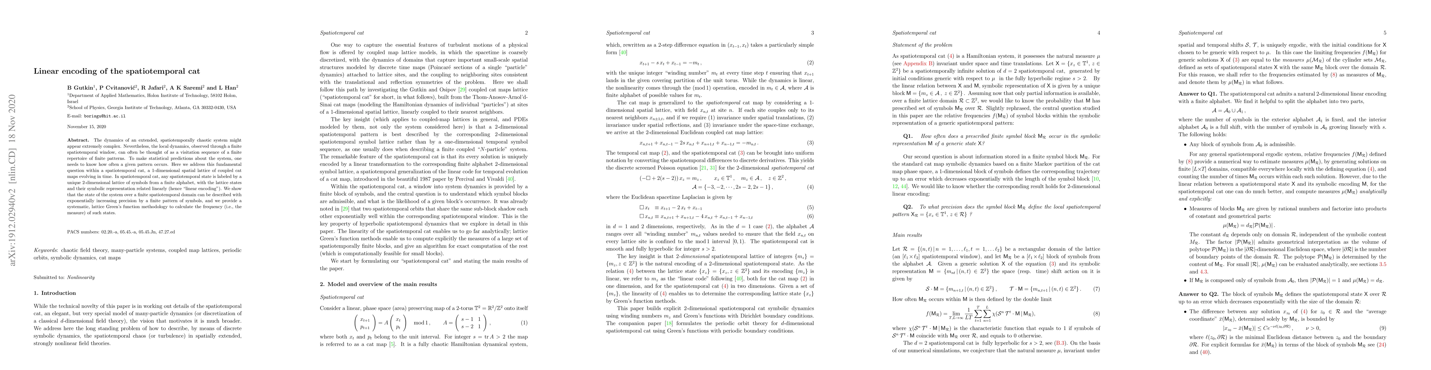 The dynamics of an extended, spatiotemporally chaotic system might appear extremely complex. Nevertheless, the local dynamics, observed through a finite spatiotemporal window, can often be thought of as a visitation sequence of a finite repertoire of finite patterns. To make statistical predictions about the system, one needs to know how often a given pattern occurs. Here we address this fundamental question within a spatiotemporal cat, a 1-dimensional spatial lattice of coupled cat maps evolving in time. In spatiotemporal cat, any spatiotemporal state is labeled by a unique 2-dimensional lattice of symbols from a finite alphabet, with the lattice states and their symbolic representation related linearly (hence "linear encoding"). We show that the state of the system over a finite spatiotemporal domain can be described with exponentially increasing precision by a finite pattern of symbols, and we provide a systematic, lattice Green's function methodology to calculate the frequency (i.e., the measure) of such states.