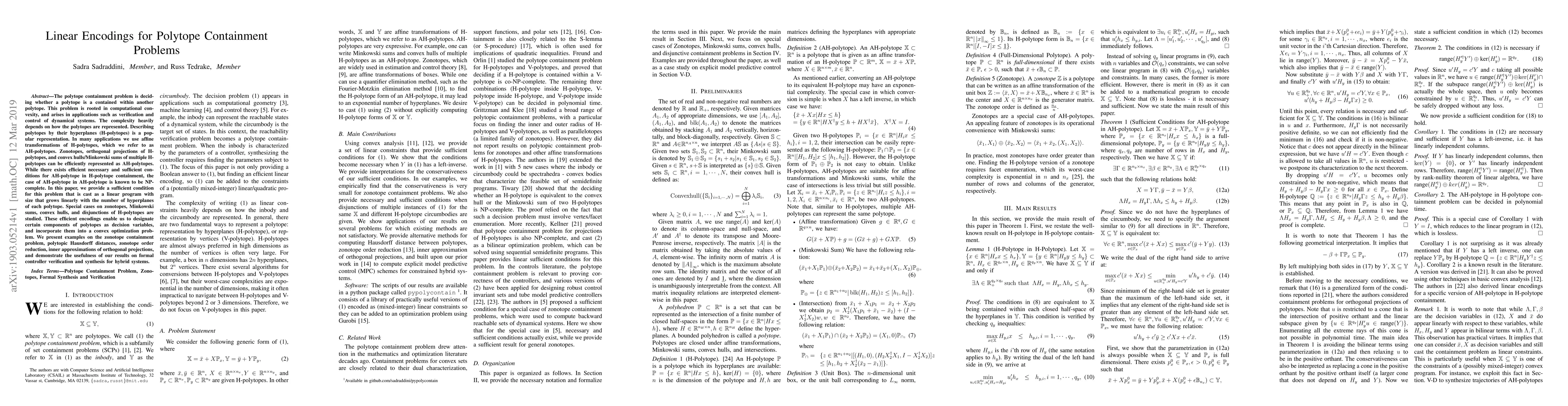 This paper proposes a linear programming approach to determine if an AH-polytope (affine transformation of H-polytope) is contained within another AH-polytope, addressing the NP-complete problem. It provides efficient linear encodings for special cases and demonstrates applications in formal verification and synthesis for hybrid systems.