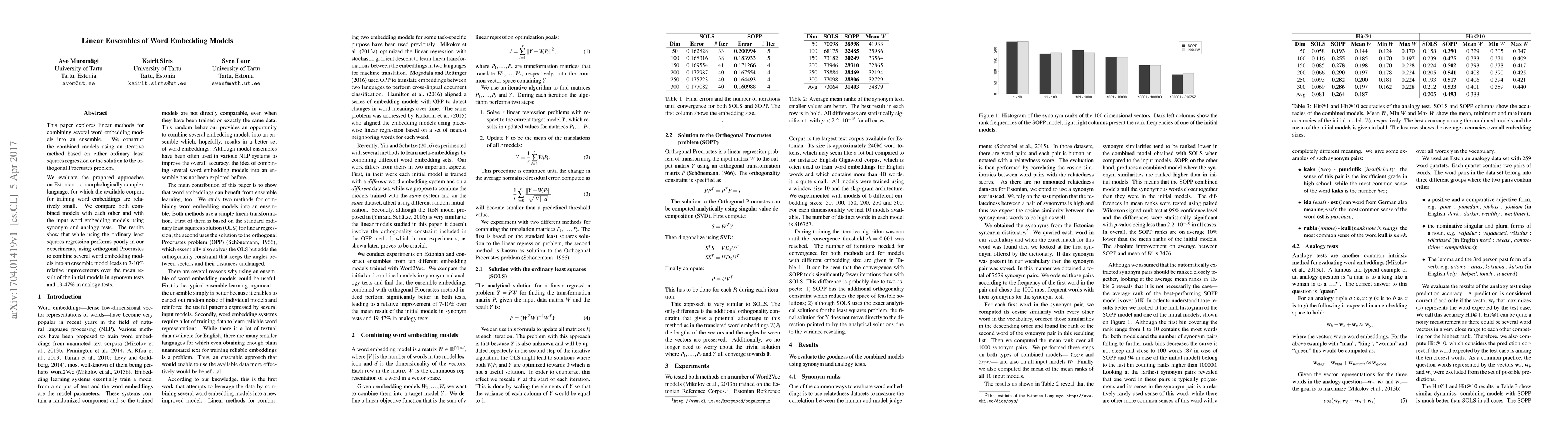 This paper explores linear methods for combining several word embedding models into an ensemble. We construct the combined models using an iterative method based on either ordinary least squares regression or the solution to the orthogonal Procrustes problem. We evaluate the proposed approaches on Estonian---a morphologically complex language, for which the available corpora for training word embeddings are relatively small. We compare both combined models with each other and with the input word embedding models using synonym and analogy tests. The results show that while using the ordinary least squares regression performs poorly in our experiments, using orthogonal Procrustes to combine several word embedding models into an ensemble model leads to 7-10% relative improvements over the mean result of the initial models in synonym tests and 19-47% in analogy tests.