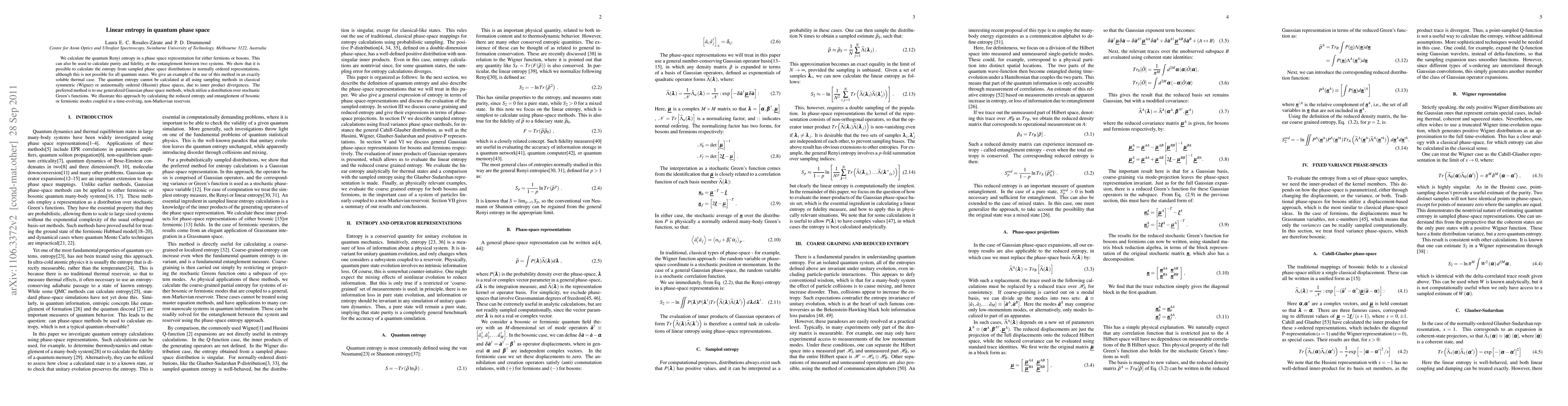 This paper calculates the quantum Renyi entropy in a phase space representation for fermions or bosons, demonstrating its utility for purity, fidelity, and entanglement. It highlights the limitations of sampling methods in classical phase spaces and proposes generalized Gaussian phase space methods for accurate entropy calculations, illustrated with a thermal case and non-Markovian reservoir examples.