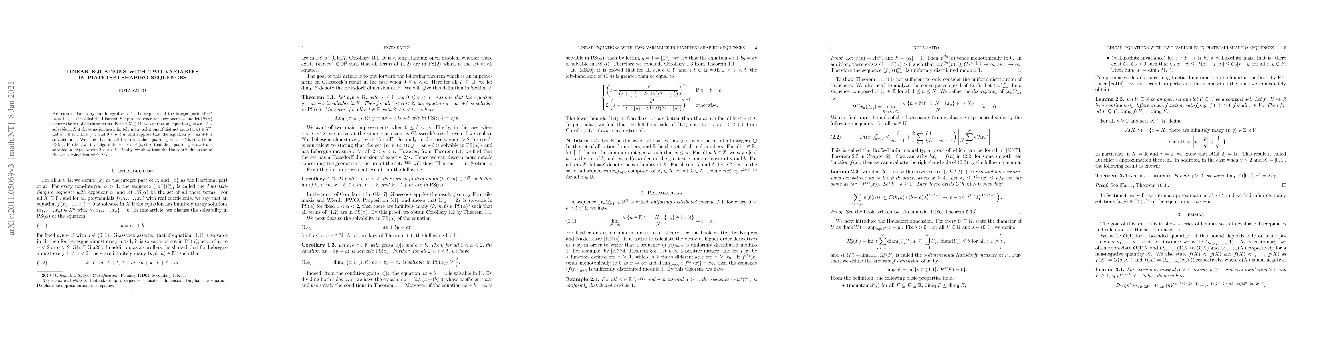 For every non-integral $\alpha>1$, the sequence of the integer parts of $n^{\alpha}$ $(n=1,2,\ldots)$ is called the Piatetski-Shapiro sequence with exponent $\alpha$, and let $\mathrm{PS}(\alpha)$ denote the set of all those terms. For all $X\subseteq \mathbb{N}$, we say that an equation $y=ax+b$ is solvable in $X$ if the equation has infinitely many solutions of distinct pairs $(x,y)\in X^2$. Let $a,b\in \mathbb{R}$ with $a\neq 1$ and $0\leq b