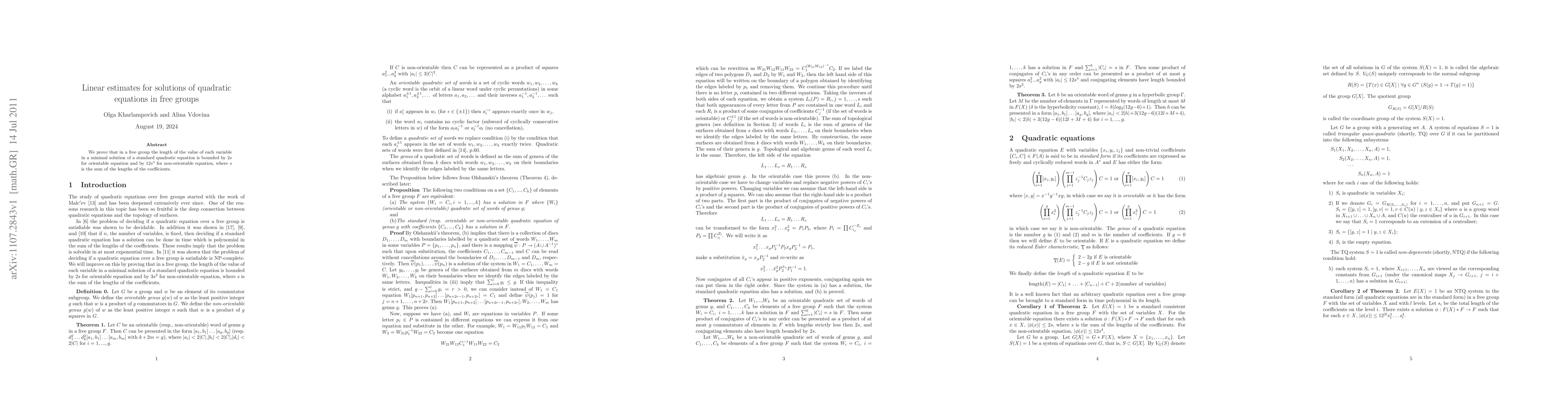 We prove that in a free group the length of the value of each variable in a minimal solution of a standard quadratic equation is bounded by $2s$ for orientable equation and by $12s^4$ for non-orientable equation, where $s$ is the sum of the lengths of the coefficients