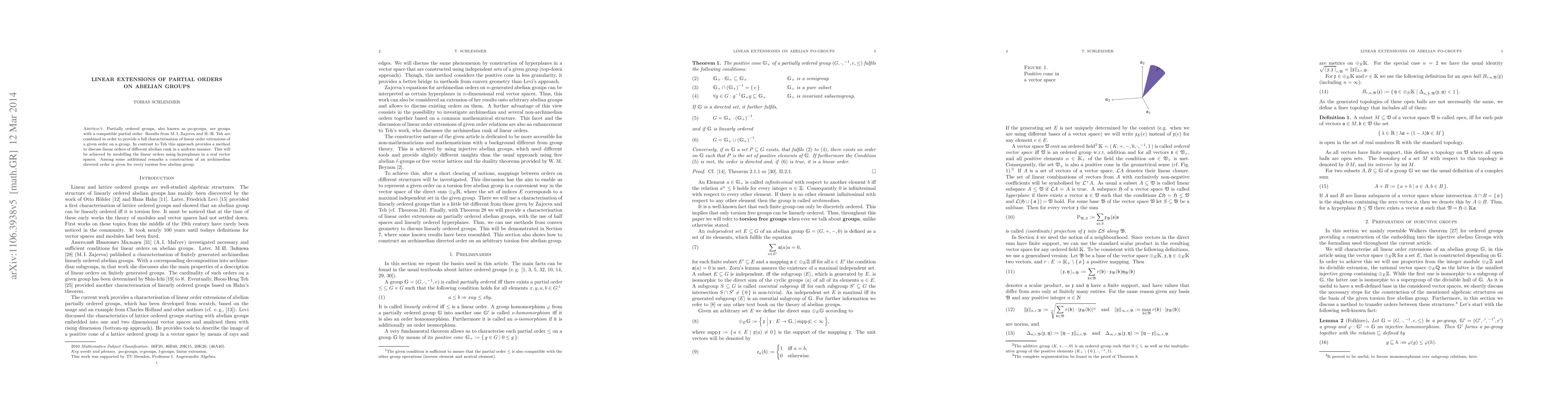 This paper characterizes linear order extensions of partial orders on Abelian groups by combining results from Zajceva and Teh, utilizing hyperplanes in real vector spaces for a uniform discussion. An archimedian directed order is also constructed for every torsion-free abelian group.