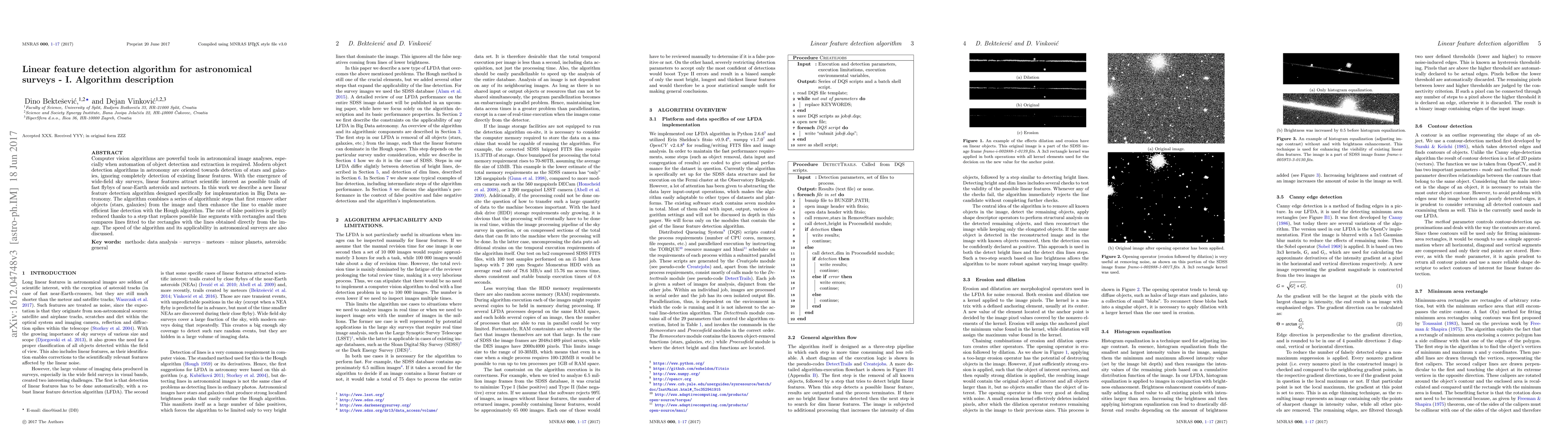 Computer vision algorithms are powerful tools in astronomical image analyses, especially when automation of object detection and extraction is required. Modern object detection algorithms in astronomy are oriented towards detection of stars and galaxies, ignoring completely detection of existing linear features. With the emergence of wide-field sky surveys, linear features attract scientific interest as possible trails of fast flybys of near-Earth asteroids and meteors. In this work we describe a new linear feature detection algorithm designed specifically for implementation in Big Data astronomy. The algorithm combines a series of algorithmic steps that first remove other objects (stars, galaxies) from the image and then enhance the line to enable more efficient line detection with the Hough algorithm. The rate of false positives is greatly reduced thanks to a step that replaces possible line segments with rectangles and then compares lines fitted to the rectangles with the lines obtained directly from the image. The speed of the algorithm and its applicability in astronomical surveys are also discussed.