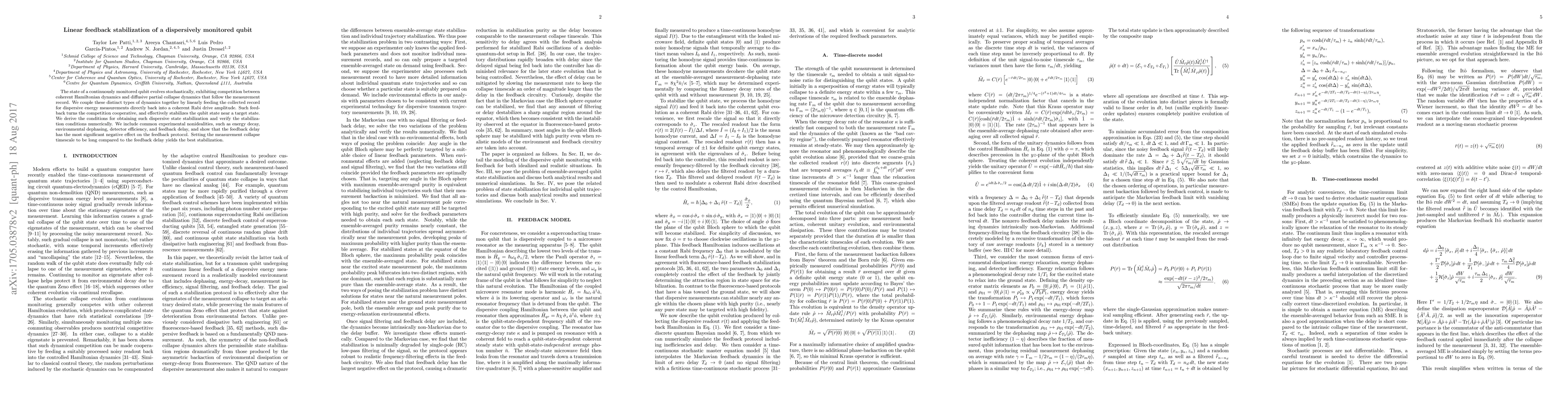 The state of a continuously monitored qubit evolves stochastically, exhibiting competition between coherent Hamiltonian dynamics and diffusive partial collapse dynamics that follow the measurement record. We couple these distinct types of dynamics together by linearly feeding the collected record for dispersive energy measurements directly back into a coherent Rabi drive amplitude. Such feedback turns the competition cooperative, and effectively stabilizes the qubit state near a target state. We derive the conditions for obtaining such dispersive state stabilization and verify the stabilization conditions numerically. We include common experimental nonidealities, such as energy decay, environmental dephasing, detector efficiency, and feedback delay, and show that the feedback delay has the most significant negative effect on the feedback protocol. Setting the measurement collapse timescale to be long compared to the feedback delay yields the best stabilization.