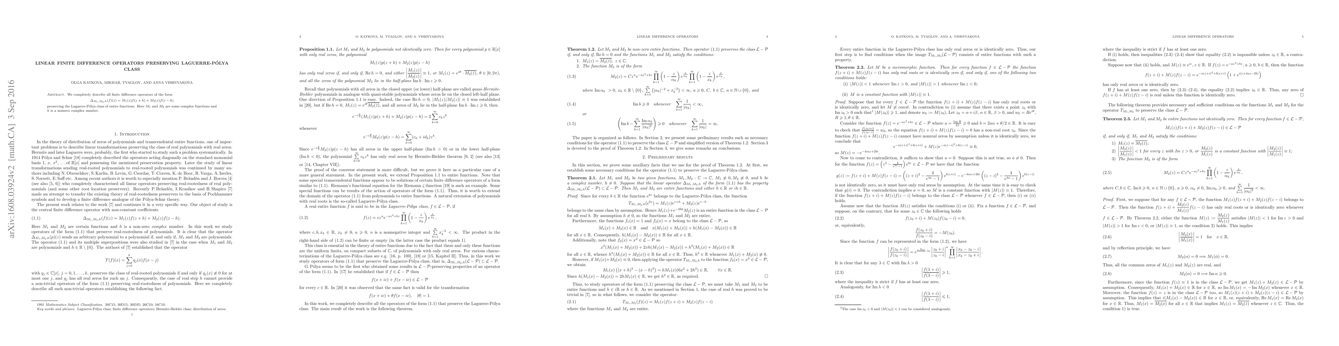 This paper identifies all linear finite difference operators that maintain the Laguerre-Pólya class of entire functions, characterized by specific forms of complex functions $M_1$ and $M_2$ along with a nonzero complex shift $h$.