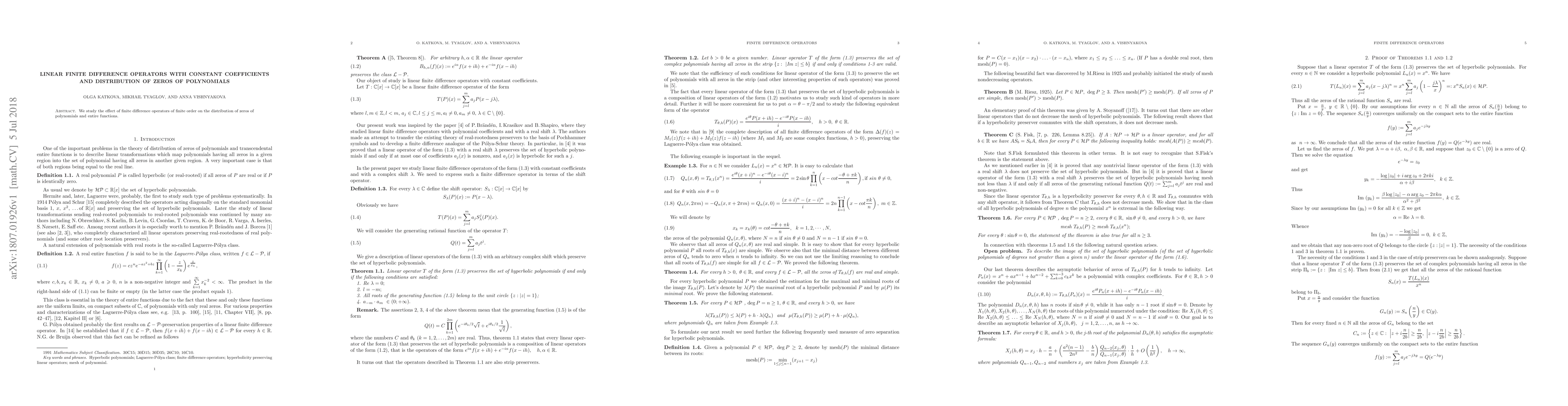 Summary: This paper investigates how linear finite difference operators with constant coefficients influence the distribution of zeros in polynomials and entire functions. The study aims to understand the structural changes these operators induce on the zero patterns.