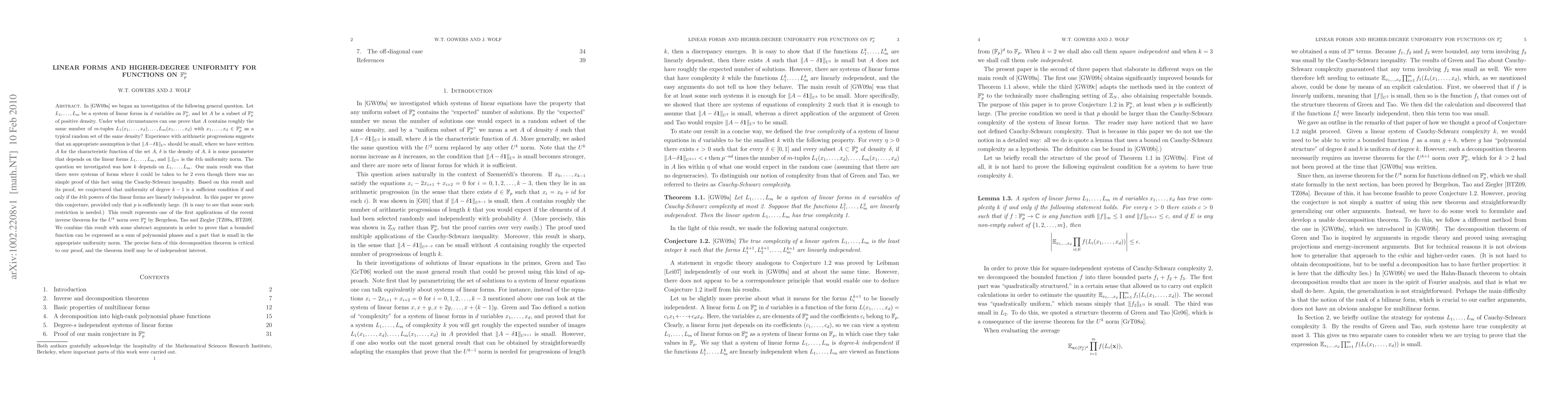In [GW09a] we conjectured that uniformity of degree $k-1$ is sufficient to control an average over a family of linear forms if and only if the $k$th powers of these linear forms are linearly independent. In this paper we prove this conjecture in $\mathbb{F}_p^n$, provided only that $p$ is sufficiently large. This result represents one of the first applications of the recent inverse theorem for the $U^k$ norm over $\mathbb{F}_p^n$ by Bergelson, Tao and Ziegler [BTZ09,TZ08]. We combine this result with some abstract arguments in order to prove that a bounded function can be expressed as a sum of polynomial phases and a part that is small in the appropriate uniformity norm. The precise form of this decomposition theorem is critical to our proof, and the theorem itself may be of independent interest.