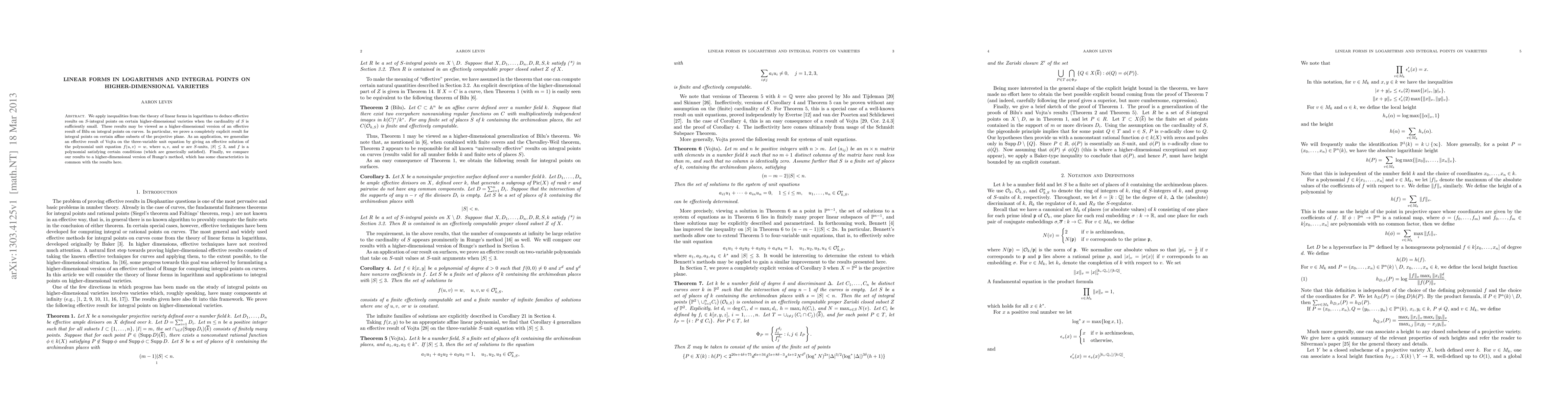 We apply inequalities from the theory of linear forms in logarithms to deduce effective results on S-integral points on certain higher-dimensional varieties when the cardinality of S is sufficiently small. These results may be viewed as a higher-dimensional version of an effective result of Bilu on integral points on curves. In particular, we prove a completely explicit result for integral points on certain affine subsets of the projective plane. As an application, we generalize an effective result of Vojta on the three-variable unit equation by giving an effective solution of the polynomial unit equation f(u,v)=w, where u,v, and w are S-units, |S|\leq 3, and f is a polynomial satisfying certain conditions (which are generically satisfied). Finally, we compare our results to a higher-dimensional version of Runge's method, which has some characteristics in common with the results here.