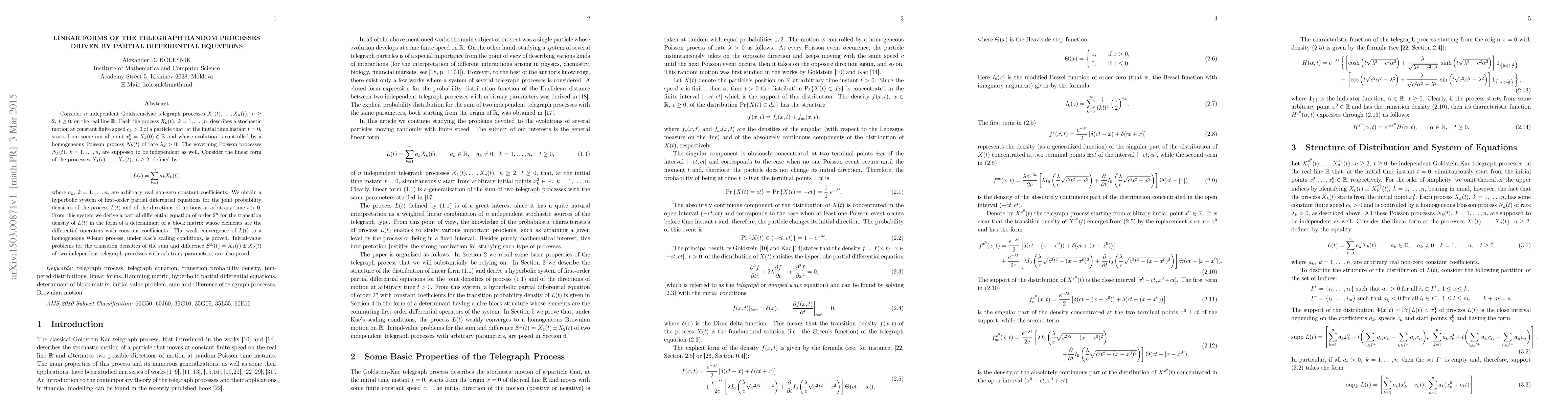 Consider $n$ independent Goldstein-Kac telegraph processes $X_1(t), \dots ,X_n(t), \; n\ge 2, \; t\ge 0,$ on the real line $\Bbb R$. Each the process $X_k(t), \; k=1,\dots,n,$ describes a stochastic motion at constant finite speed $c_k>0$ of a particle that, at the initial time instant $t=0$, starts from some initial point $x_k^0=X_k(0)\in\Bbb R$ and whose evolution is controlled by a homogeneous Poisson process $N_k(t)$ of rate $\lambda_k>0$. The governing Poisson processes $N_k(t), \; k=1,\dots,n,$ are supposed to be independent as well. Consider the linear form of the processes $X_1(t), \dots ,X_n(t), \; n\ge 2,$ defined by $$L(t) = \sum_{k=1}^n a_k X_k(t) ,$$ where $a_k, \; k=1,\dots,n,$ are arbitrary real non-zero constant coefficients. We obtain a hyperbolic system of first-order partial differential equations for the joint probability densities of the process $L(t)$ and of the directions of motions at arbitrary time $t>0$. From this system we derive a partial differential equation of order $2^n$ for the transition density of $L(t)$ in the form of a determinant of a block matrix whose elements are the differential operators with constant coefficients. The weak convergence of $L(t)$ to a homogeneous Wiener process, under Kac's scaling conditions, is proved. Initial-value problems for the transition densities of the sum and difference $S^{\pm}(t)=X_1(t) \pm X_2(t)$ of two independent telegraph processes with arbitrary parameters, are also posed.