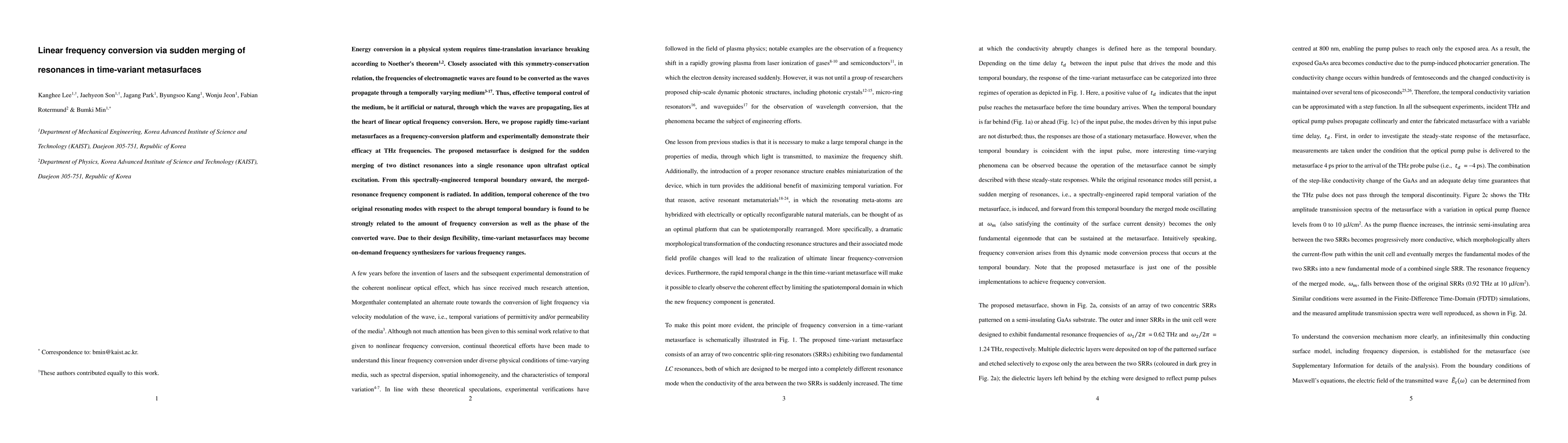 Energy conversion in a physical system requires time-translation invariance breaking according to Noether's theorem. Closely associated with this symmetry-conservation relation, the frequencies of electromagnetic waves are found to be converted as the waves propagate through a temporally varying medium. Thus, effective temporal control of the medium, be it artificial or natural, through which the waves are propagating, lies at the heart of linear optical frequency conversion. Here, we propose rapidly time-variant metasurfaces as a frequency-conversion platform and experimentally demonstrate their efficacy at THz frequencies. The proposed metasurface is designed for the sudden merging of two distinct resonances into a single resonance upon ultrafast optical excitation. From this spectrally-engineered temporal boundary onward, the merged-resonance frequency component is radiated. In addition, temporal coherence of the two original resonating modes with respect to the abrupt temporal boundary is found to be strongly related to the amount of frequency conversion as well as the phase of the converted wave. Due to their design flexibility, time-variant metasurfaces may become on-demand frequency synthesizers for various frequency ranges.