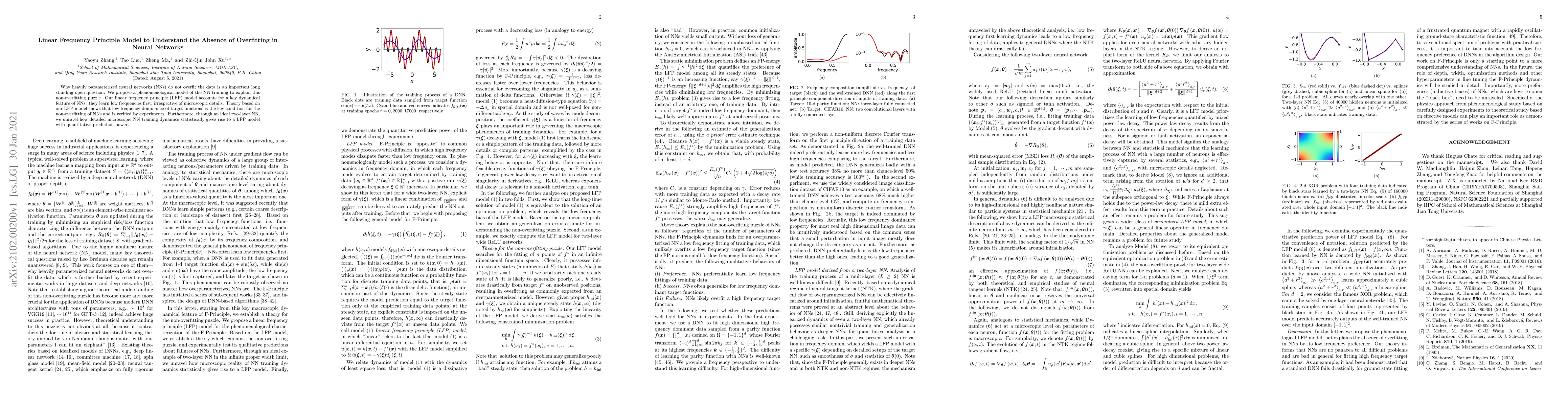 Why heavily parameterized neural networks (NNs) do not overfit the data is an important long standing open question. We propose a phenomenological model of the NN training to explain this non-overfitting puzzle. Our linear frequency principle (LFP) model accounts for a key dynamical feature of NNs: they learn low frequencies first, irrespective of microscopic details. Theory based on our LFP model shows that low frequency dominance of target functions is the key condition for the non-overfitting of NNs and is verified by experiments. Furthermore, through an ideal two-layer NN, we unravel how detailed microscopic NN training dynamics statistically gives rise to a LFP model with quantitative prediction power.