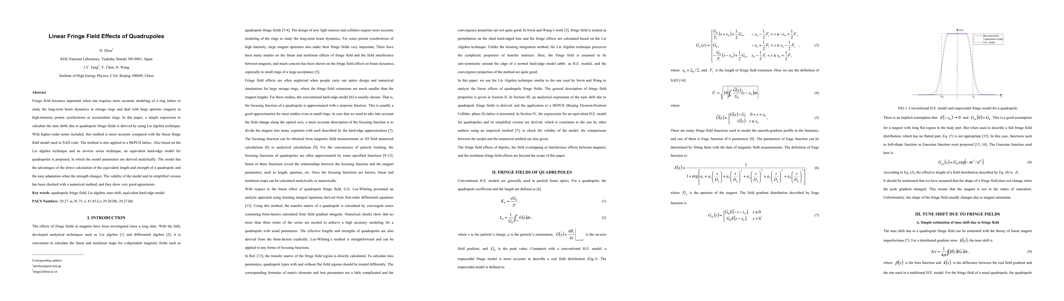 Fringe field becomes important when one requires more accurate modeling of a ring lattice to study the long-term beam dynamics in storage rings and deal with large aperture magnets in high-intensity proton synchrotrons or accumulator rings. In this paper, a simple expression to calculate the tune shifts due to quadrupole fringe fields is derived by using Lie algebra technique. With higher-order terms included, this method is more accurate compared with the linear fringe field model used in SAD code. The method is also applied to a BEPCII lattice. Also based on the Lie algebra technique and an inverse series technique, an equivalent hard-edge model for quadrupoles is proposed, in which the model parameters are derived analytically. The model has the advantages of the direct calculation of the equivalent length and strength of a quadrupole and the easy adaptation when the strength changes. The validity of the model and its simplified version has been checked with a numerical method, and they show very good agreements.