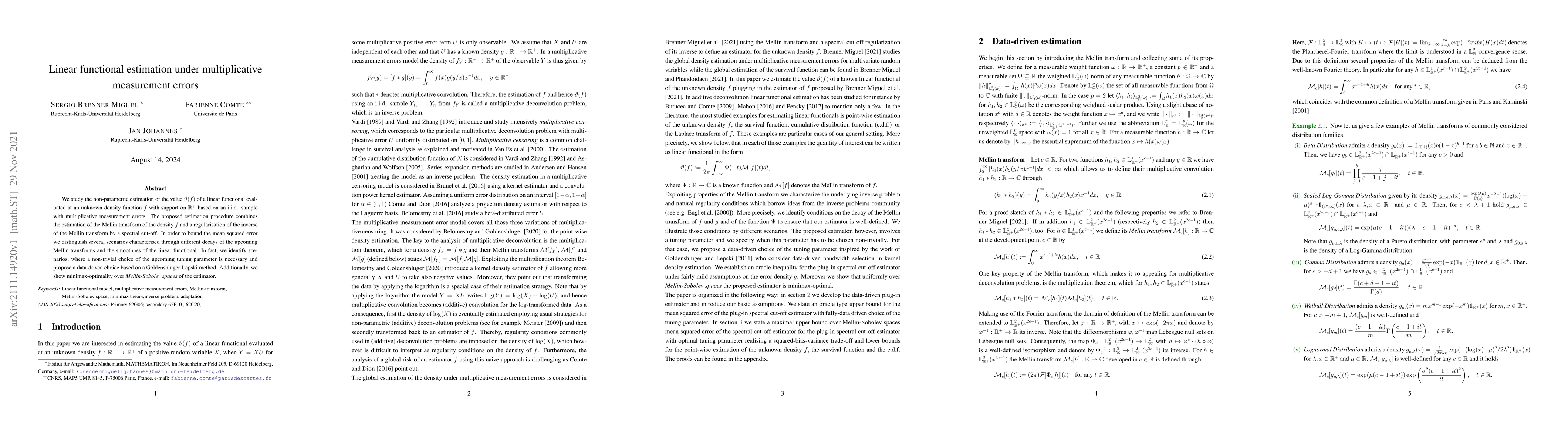 This paper proposes a method for estimating a linear functional under multiplicative measurement errors by combining Mellin transform estimation and regularization. It introduces a data-driven tuning parameter selection based on the Goldenshluger-Lepski method and demonstrates minimax-optimality of the estimator in Mellin-Sobolev spaces.
